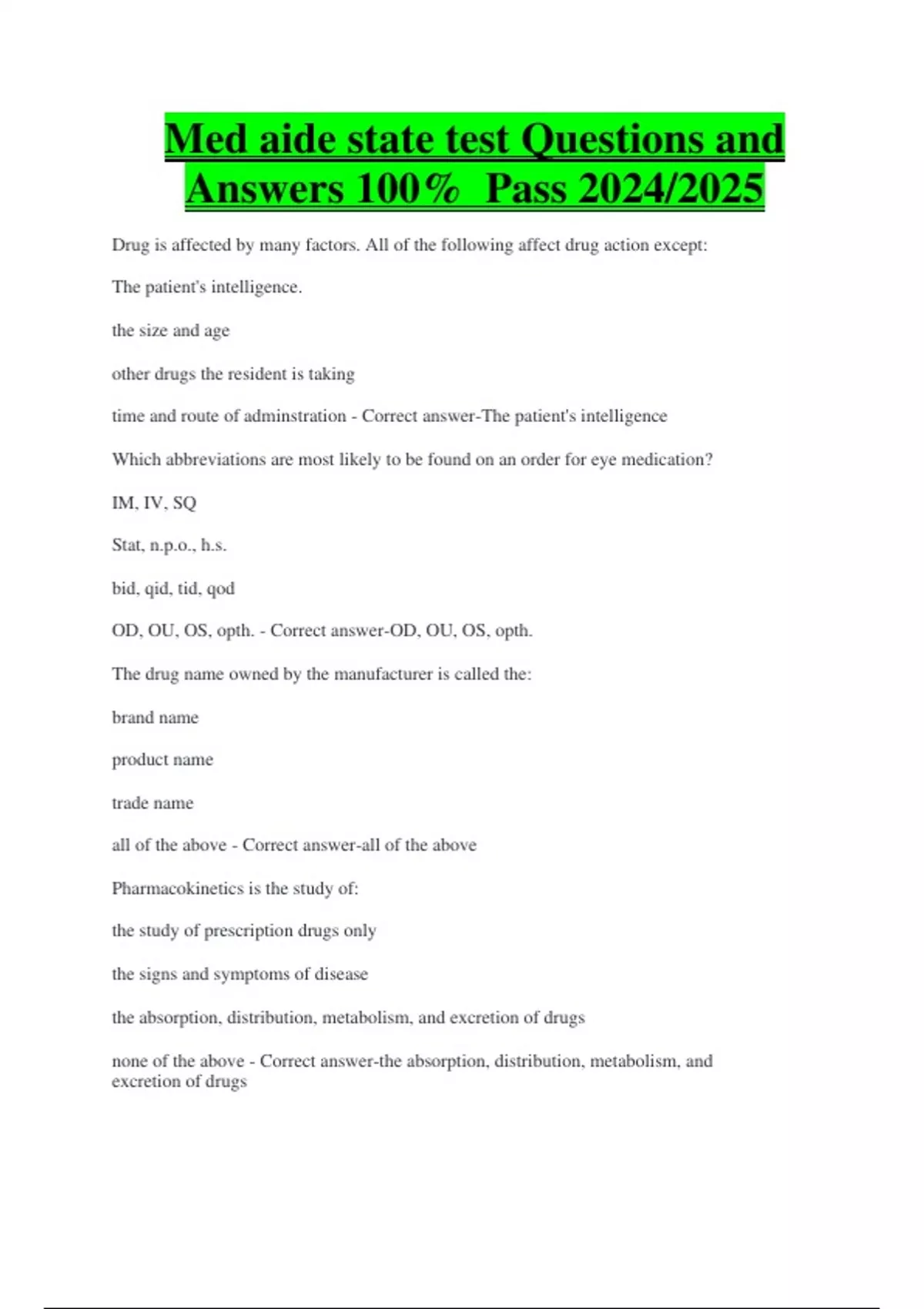 Med aide state test Questions and Answers 100% Pass 2024/2025 Drug is affected by many factors. All of the following affect drug action except: The patient's intelligence. the size and age other drugs the resident is taking time and route of adminstration - Correct answer-The patient's intelligence Which abbreviations are most likely to be found on an order for eye medication? IM, IV, SQ Stat, n.p.o., h.s. bid, qid, tid, qod OD, OU, OS, opth. - Correct answer-OD, OU, OS, opth. The drug name owned by the manufacturer is called the: brand name product name trade name all of the above - Correct answer-all of the above Pharmacokinetics is the study of: the study of prescription drugs only the signs and symptoms of disease
