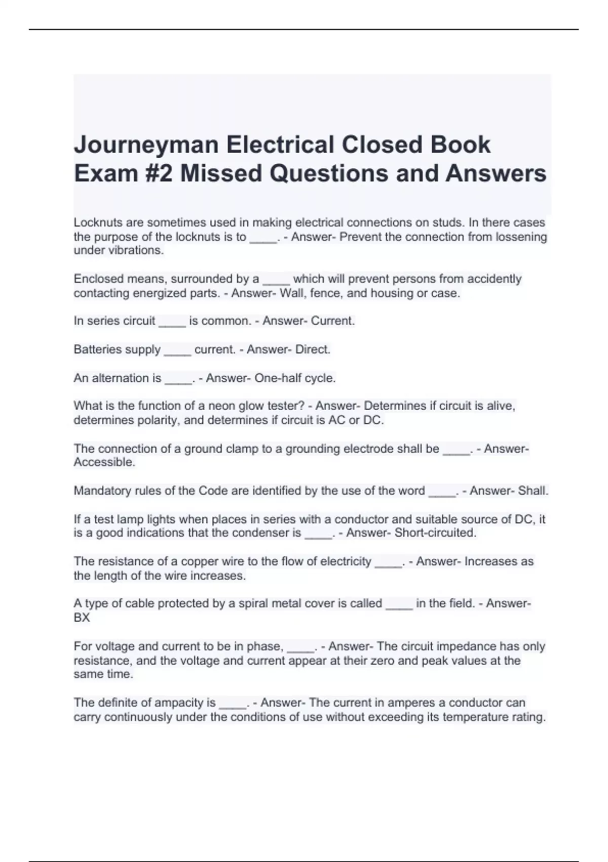 Journeyman Electrical Closed Book Exam #2 Missed Questions and Answers