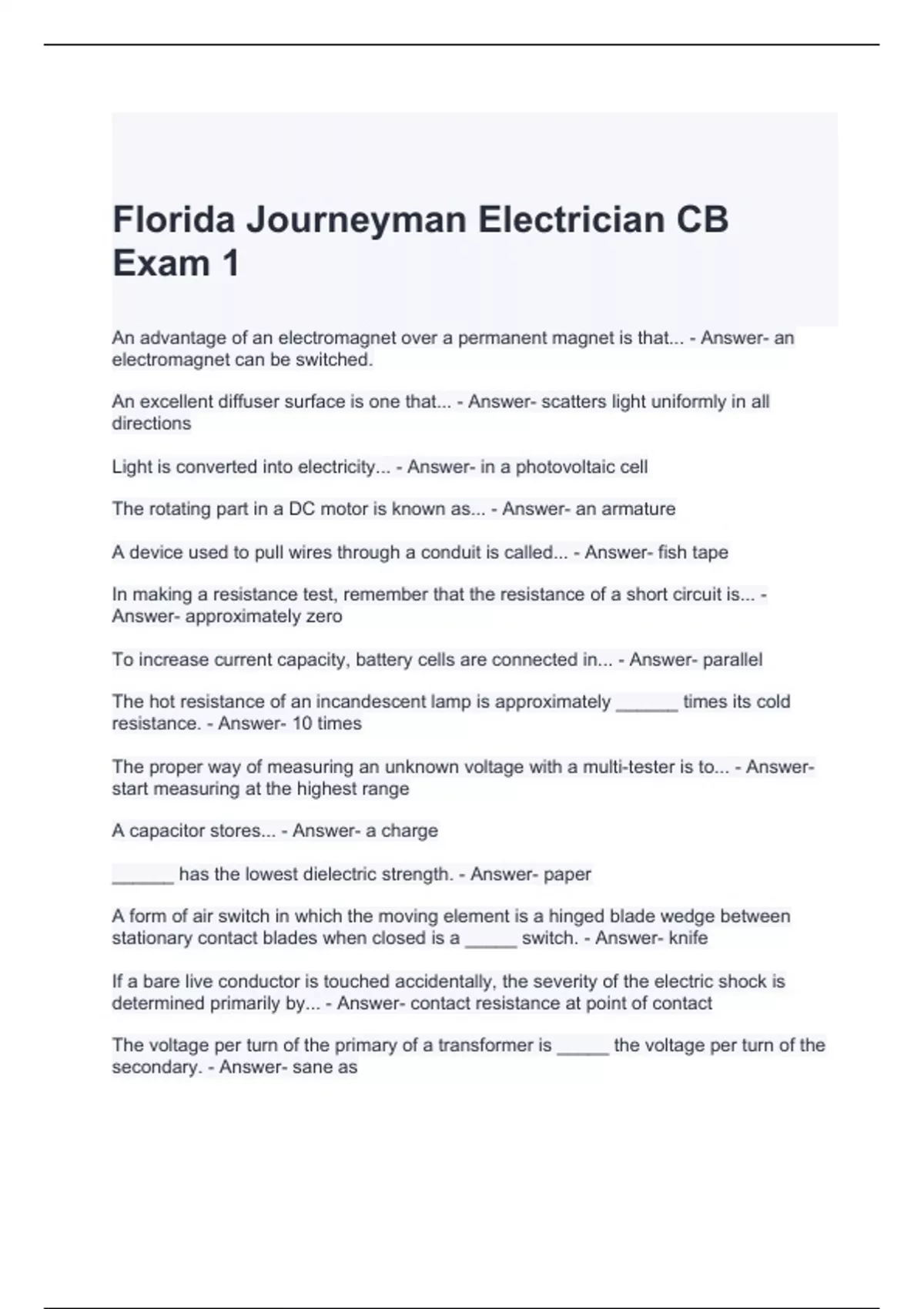 Florida Journeyman Electrician CB Exam 1 with 100% correct Answers