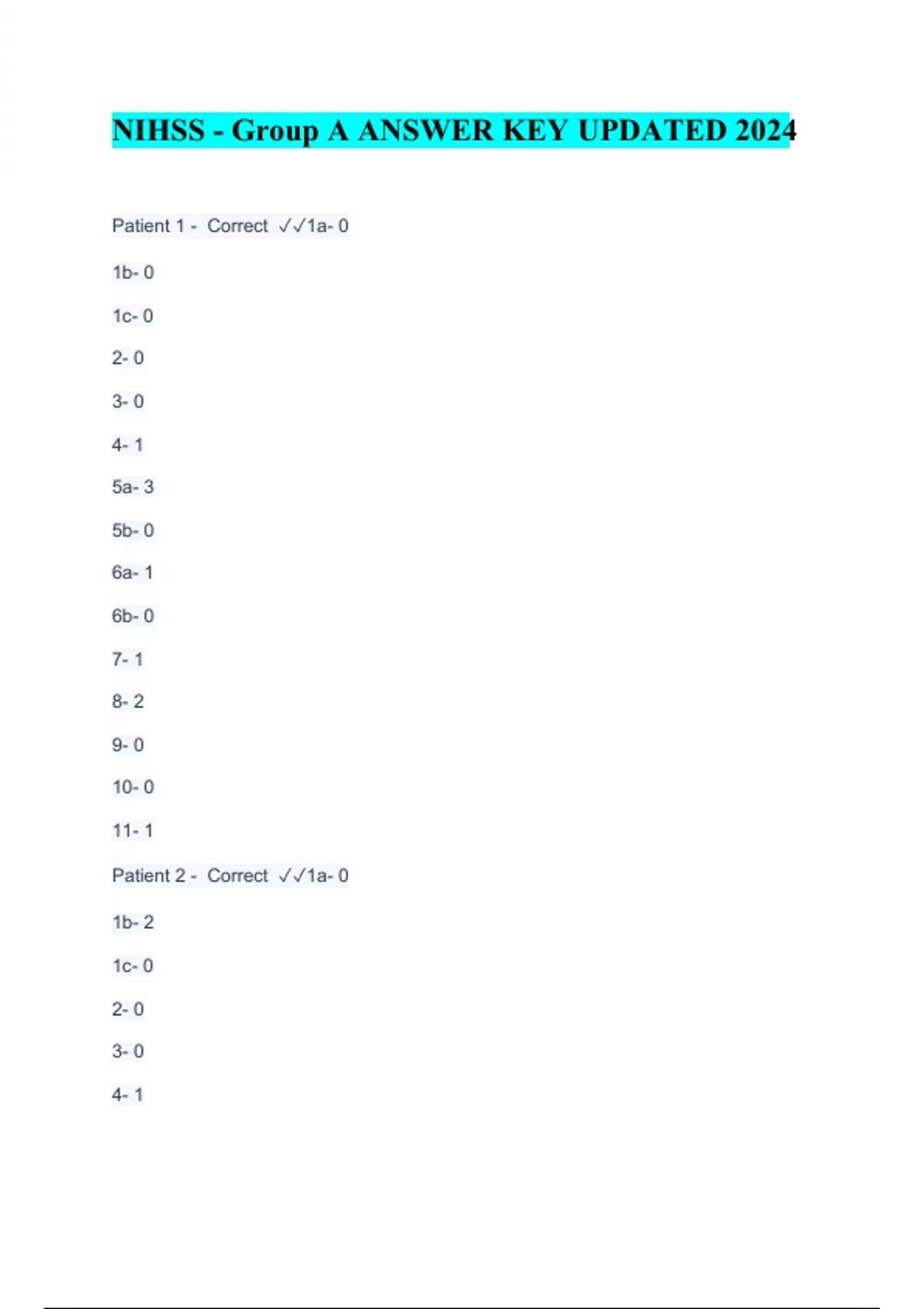 NIHSS - Group A ANSWER KEY UPDATED . Patient 1 - Correct 1a- 0 1b- 0 1c- 0 2- 0 3- 0 4- 1 5a- 3 5b- 0 6a- 1 6b- 0