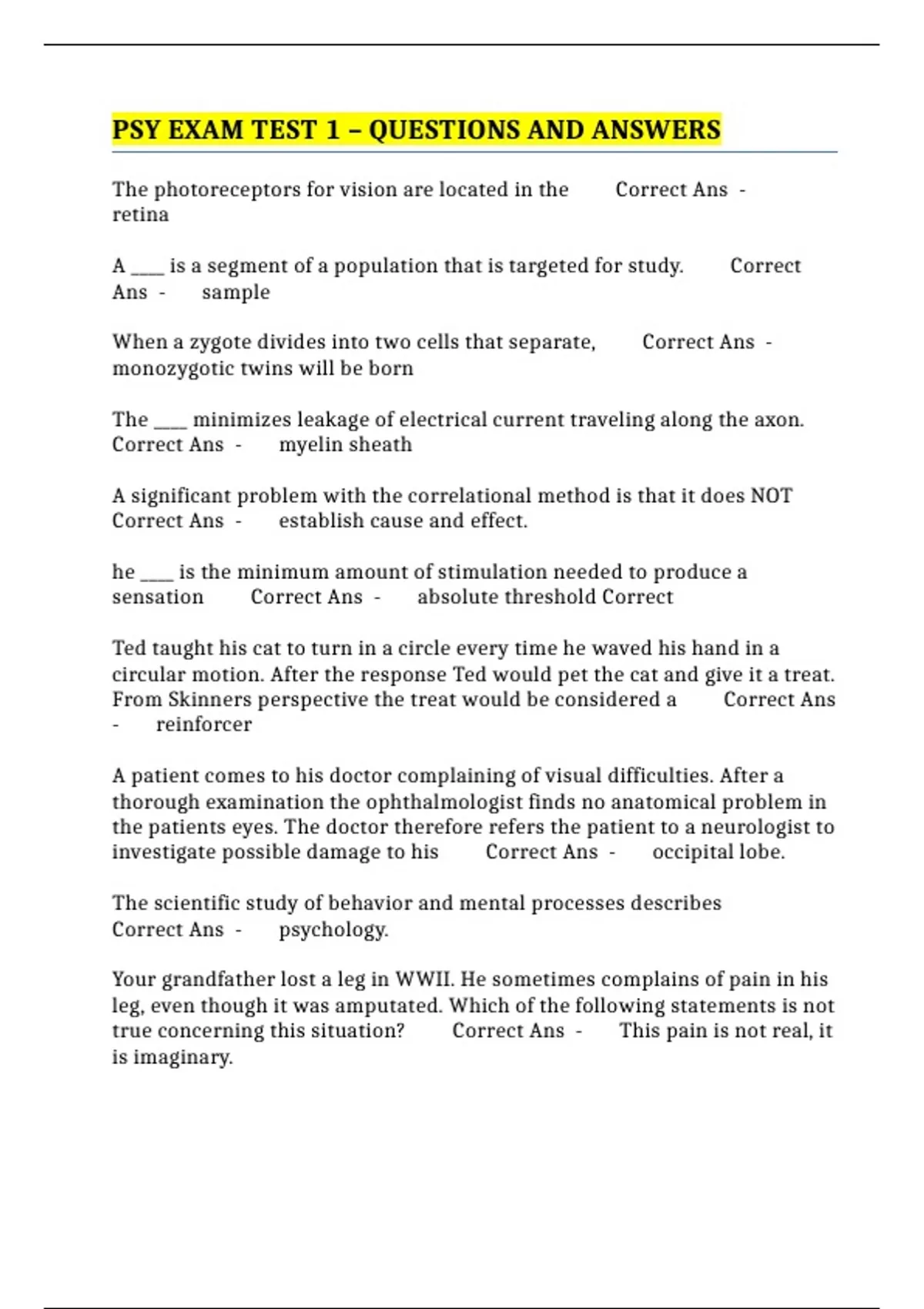 PSY EXAM TEST 1 – QUESTIONS AND ANSWERS
