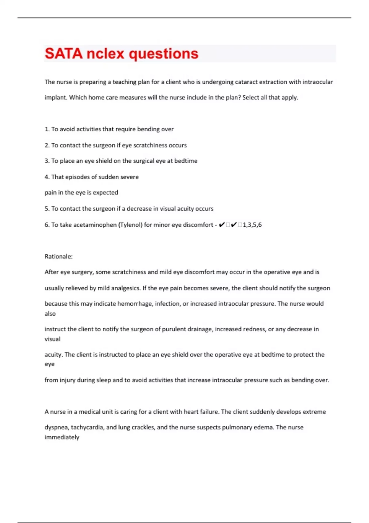 The nurse is preparing a teaching plan for a client who is undergoing cataract extraction with intraocular implant. Which home care measures will the nurse include in the plan? Select all that apply. 1. To avoid activities that require bending over 2. To contact the surgeon if eye scratchiness occurs 3. To place an eye shield on the surgical eye at bedtime 4. That episodes of sudden severe pain in the eye is expected 5. To contact the surgeon if a decrease in visual acuity occurs 6. To take acetaminophen (Tylenol) for minor eye discomfort - ️️1,3,5,6 Rationale: After eye surgery, some scratchiness and mild eye discomfort may occur in the operative eye and is usually relieved by mild analgesics. If the eye pain becomes severe, the client should notify the surgeon because this may indicate hemorrhage, infection, or increased intraocular pressure. The nurse would also instruct the client to notify the surgeon of purulent drainage, increased redness, or any decrease in visual acuity. The client is instructed to place an eye shield over the operative eye at bedtime to protect the eye from injury during sleep and to avoid activities that increase intraocular pressure such as bending over. A nurse in a medical unit is caring for a client with heart failure. The client suddenly develops extreme dyspnea, tachycardia, and lung crackles, and the nurse suspects pulmonary edema. The nurse immediately notifies the registered nurse and expects which interventions to be prescribed? Select all that apply.
