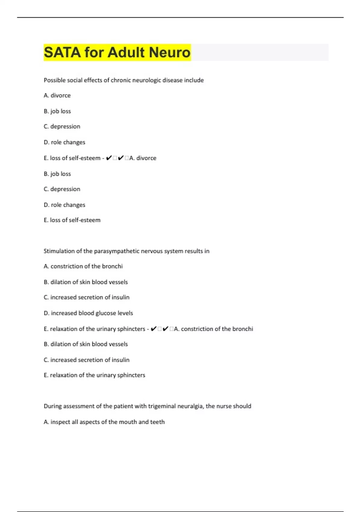 Possible social effects of chronic neurologic disease include A. divorce B. job loss C. depression D. role changes E. loss of self-esteem - ️️A. divorce B. job loss C. depression D. role changes E. loss of self-esteem Stimulation of the parasympathetic nervous system results in A. constriction of the bronchi B. dilation of skin blood vessels C. increased secretion of insulin D. increased blood glucose levels E. relaxation of the urinary sphincters - ️️A. constriction of the bronchi B. dilation of skin blood vessels C. increased secretion of insulin E. relaxation of the urinary sphincters