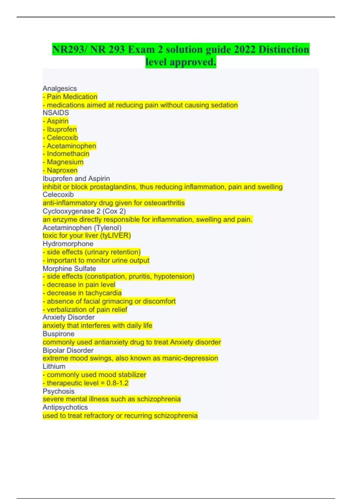NR293/ NR 293 Exam 2 solution guide 2022 Distinction level approved. Analgesics - Pain Medication - medications aimed at reducing pain without causing sedation NSAIDS - Aspirin - Ibuprofen - Celecoxib - Acetaminophen - Indomethacin - Magnesium - Naproxen Ibuprofen and Aspirin inhibit or block prostaglandins, thus reducing inflammation, pain and swelling Celecoxib anti-inflammatory drug given for osteoarthritis Cyclooxygenase 2 (Cox 2) an enzyme directly responsible for inflammation, swelling and pain. Acetaminophen (Tylenol) toxic for your liver (tyLIVER) Hydromorphone - side effects (urinary retention) - important to monitor urine output Morphine Sulfate - side effects (constipation, pruritis, hypotension) - decrease in pain level - decrease in tachycardia - absence of facial grimacing or discomfort - verbalization of pain relief Anxiety Disorder anxiety that interferes with daily life Buspirone commonly used antianxiety drug to treat Anxiety disorder Bipolar Disorder extreme mood swings, also known as manic-depression Lithium - commonly used mood stabilizer - therapeutic level = 0.8-1.2 Psychosis severe mental illness such as schizophrenia Antipsychotics used to treat refractory or recurring schizophrenia Risperidone helps to reduce paranoia and delusions Antidepressants - may take up to 4 weeks to notice therapeutic effects - prevent the absorption of serotonin in the body, thus increasing concentration in the brain, elevating mood Serotonin - acts as neurotransmitter - mostly in the brain but found in digestive system and blood platelets - mood, sexual desire, appetite, sleep, memory, temperature regulation and social behavior Serotonin Syndrome - when there is too much serotonin in the body - excessive nerve cell activity which can be fatal (agitation, confusion, increased heart rate, tremors, fever) Tricyclic Antidepressants - blocks serotonin absorption - overdose can cause cardiac dysrhythmias - toxicity occurs when mixed with alcohol Selective Serotonin Reuptake Inhibitors - blocks serotonin absorption - cannot be taken with anticoagulants because it can cause excessive bleeding - high protein bound Monoamine Oxidase Inhibitors - reduce the activity of the enzyme MAO, which results in higher levels of norepinephrine, serotonin and dopamine in the brain, enhancing mood - break down catecholamines in the CNS - taken with foods high in Tyramine can cause dangerously high blood pressure Norepinephrine influences sleep and alertness and is believed to be correlated to the fight or flight stress response Dopamine influences body movements and is also believed to be involved in motivation, reward, reinforcement and addictive behavior MAOIs: side effect - many patients experience dry mouth - antidepressants prevent acetylcholine from reaching muscarinic receptors in the salivary glands causing cotton mouth Drug/Food Interaction - MAOIs AVOID: cheese, processed meats and red wine St. John's Wort - when combined with antidepressants can cause adverse effects - duloxetine and sertraline + St. John's Wort = Serotonin Syndrome Opioids - used to relieve pain - withdrawal = runny nose, sweating, tearing hypertension, rapid heartbeat and increased respiratory rate Methadone - used to treat opiate addiction and relieve pain - blocks the receptors in the brain the are affected by opiates - effects last 24 to 36 hours Naloxone - an opioid antidote that blocks or inhibits the effects of narcotic overdose such as morphine sulfate - antagonist drug that reverses respiratory depression Benzodiazepines - relaxes muscles and relieves anxiety, insomnia, seizures and alcohol withdrawal symptoms - prescribed as anesthetic before procedures - increases neurotransmitter gamma aminobutyric acid, causing relaxation Gamma Aminobutyric Acid - low levels cause anxiety - high levels cause relaxation Smoking (Gum) - nicotine gum releases and immediate dose of nicotine - rapid chewing releases it quicker - can cause drowsiness Heroin - Naltrexone is commonly used to treat heroin addiction - decreases effect of opioid drugs - blocks euphoric effects Alcohol - alcoholics typically have vitamin B deficiency - leads to Wernicke's Encephelopathy and/or Korsakoff's Psychosis - alcoholism causes hypertension, agitation and tremors Wernicke's Encephelopathy/Korsakoff's Psychosis neurological disorders and acute brain reactions due to lack of Thiamine or Vitamin B1 Disulfiram - common treatment for chronic alcoholism - produces acute sensitivity to alcohol by causing unpleasant reactions when alcohol is consumed, such and hangover effects - educate on OTC drugs that contain alcohol to avoid adverse effects CNS part of the nervous system that consists of the brain and spinal cord Barbiturates - largely replaced with benzodiazepines due to safety - addictive - anesthesia for procedures, anticonvulsants and sedatives - antidote = activated charcoal Phenobarbital - longer half life allows for once a day dosing - interferes with REM sleep causing irritability, difficulty dealing with stress Anxiolytics relieve anxiety Flumazenil - overdose antidote for Benzodiazepines - competes with benzo receptor sites and blocks benzo effects Herbal Supplements: Benzodiazepines - avoid using the two together - grapefruit juice, st. john's word, kava act similarly to diazepam -combining the two can exacerbate relaxation and drowsiness Nonbenzodiazepine Hypnotics - used to treat insomnia - pregnancy category C - animal studies show adverse effects in fetus (not studied in humans) Zolpidem - short term (limit 7-10 days) - less grogginess in the morning - overnight or red eye flights (helps adjust to different time zones - long term use causes sleep walking and sleep driving - acts immediately and lasts 8 hours Eszoplicone approved for long term therapy, acts immediately and lasts 8 hours Remelteon - take 30 minutes before bedtime - containdicated in liver disease Muscle Relaxants - relieve pain associated with skeletal muscle spasm and spasticity