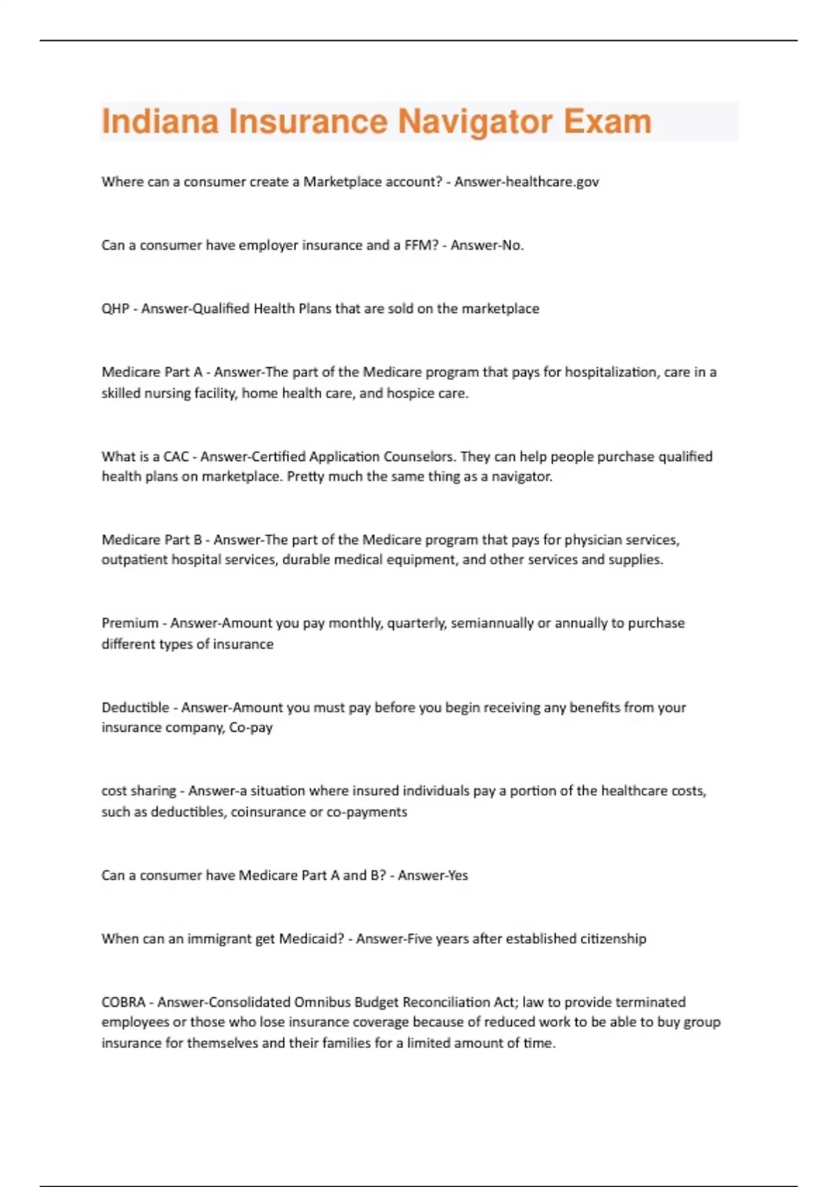 Where can a consumer create a Marketplace account? - A Can a consumer have employer insurance and a FFM? - Answer-No. QHP - Answer-Qualified Health Plans that are sold on the marketplace Medicare Part A - Answer-The part of the Medicare program that pays for hospitalization, care in a skilled nursing facility, home health care, and hospice care. What is a CAC - Answer-Certified Application Counselors. They can help people purchase qualified health plans on marketplace. Pretty much the same thing as a navigator. Medicare Part B - Answer-The part of the Medicare program that pays for physician services, outpatient hospital services, durable medical equipment, and other services and supplies. Premium - Answer-Amount you pay monthly, quarterly, semiannually or annually to purchase different types of insurance Deductible - Answer-Amount you must pay before you begin receiving any benefits from your insurance company, Co-pay cost sharing - Answer-a situation where insured individuals pay a portion of the healthcare costs, such as deductibles, coinsurance or co-payments Can a consumer have Medicare Part A and B? - Answer-Yes When can an immigrant get Medicaid? - Answer-Five years after established citizenship COBRA - Answer-Consolidated Omnibus Budget Reconciliation Act; law to provide terminated employees or those who lose insurance coverage because of reduced work to be able to buy group insurance for themselves and their families for a limited amount of time.Where can you apply for Indiana Medicaid Programs? - A Indiana Health Coverage Program (IHCP) - Answer-Umbrella term for several programs through Medicaid, like CHIP and HIP Hoosier Healthwise - Answer-Low income pregnant women, and children under 19 Presumptive Eligibility (PE) - Answer-Allows Medicaid benefits to begin early before official enrollment and is declared by a hospital or mental health facility.