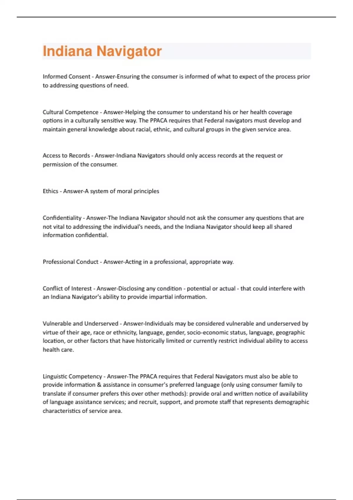 Informed Consent - Answer-Ensuring the consumer is informed of what to expect of the process prior to addressing questions of need. Cultural Competence - Answer-Helping the consumer to understand his or her health coverage options in a culturally sensitive way. The PPACA requires that Federal navigators must develop and maintain general knowledge about racial, ethnic, and cultural groups in the given service area. Access to Records - Answer-Indiana Navigators should only access records at the request or permission of the consumer. Ethics - Answer-A system of moral principles Confidentiality - Answer-The Indiana Navigator should not ask the consumer any questions that are not vital to addressing the individual's needs, and the Indiana Navigator should keep all shared information confidential. Professional Conduct - Answer-Acting in a professional, appropriate way. Conflict of Interest - Answer-Disclosing any condition - potential or actual - that could interfere with an Indiana Navigator's ability to provide impartial information. Vulnerable and Underserved - Answer-Individuals may be considered vulnerable and underserved by virtue of their age, race or ethnicity, language, gender, socio-economic status, language, geographic location, or other factors that have historically limited or currently restrict individual ability to access health care. Linguistic Competency - Answer-The PPACA requires that Federal Navigators must also be able to provide information & assistance in consumer's preferred language (only using consumer family to translate if consumer prefers this over other methods): provide oral and written notice of availability of language assistance services; and recruit, support, and promote staff that represents demographic characteristics of service area.Commitment to Clients - Answer-Promoting the needs identified by the consumer by listening to the consumer, using best judgment to determine the type of help the individual needs, and working within the Indiana Navigator's scope of knowledge and training in order to address those needs. Self - Determination - Answer-Promoting the consumer's ability to make better, more informed choices about what is best for him or her