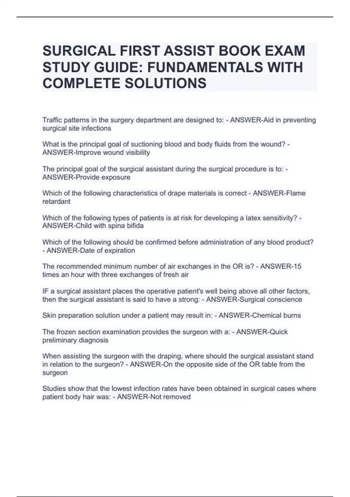 SURGICAL FIRST ASSIST BOOK EXAM STUDY GUIDE: FUNDAMENTALS WITH COMPLETE SOLUTIONSSURGICAL FIRST ASSIST BOOK EXAM STUDY GUIDE: FUNDAMENTALS WITH COMPLETE SOLUTIONSSURGICAL FIRST ASSIST BOOK EXAM STUDY GUIDE: FUNDAMENTALS WITH COMPLETE SOLUTIONS Traffic patterns in the surgery department are designed to: - ANSWER-Aid in preventing surgical site infections What is the principal goal of suctioning blood and body fluids from the wound? - ANSWER-Improve wound visibility The principal goal of the surgical assistant during the surgical procedure is to: - ANSWER-Provide exposure