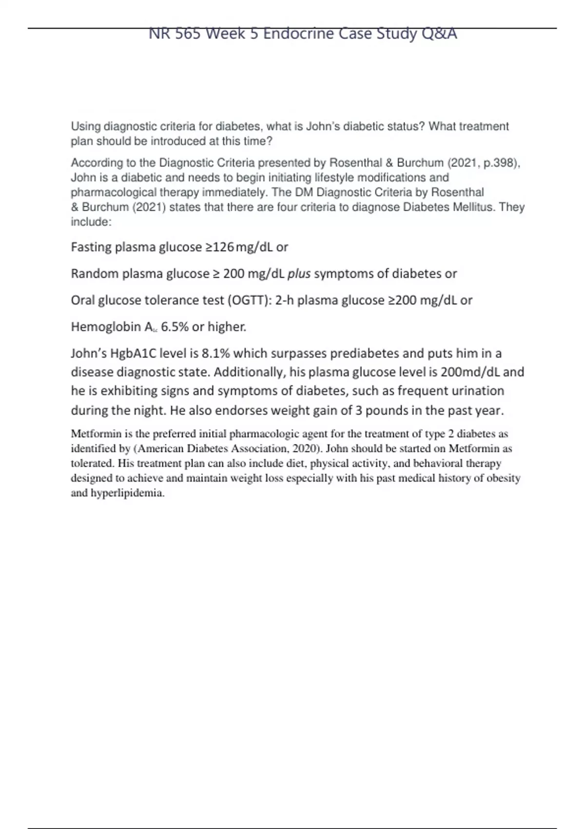 NR 565 Week 5 Endocrine Case Study Q&A Using diagnostic criteria for diabetes, what is John’s diabetic status? What treatment plan should be introduced at this time? According to the Diagnostic Criteria presented by Rosenthal & Burchum (2021, p.398), John is a diabetic and needs to begin initiating lifestyle modifications and pharmacological therapy immediately. The DM Diagnostic Criteria by Rosenthal & Burchum (2021) states that there are four criteria to diagnose Diabetes Mellitus. They include: Fasting plasma glucose ≥126mg/dL or Random plasma glucose ≥ 200 mg/dL plus symptoms of diabetes or Oral glucose tolerance test (OGTT): 2-h plasma glucose ≥200 mg/dL or Hemoglobin A1c 6.5% or higher. John’s HgbA1C level is 8.1% which surpasses prediabetes and puts him in a disease diagnostic state. Additionally, his plasma glucose level is 200md/dL and he is exhibiting signs and symptoms of diabetes, such as frequent urination during the night. He also endorses weight gain of 3 pounds in the past year. Metformin is the preferred initial pharmacologic agent for the treatment of type 2 diabetes as identified by (American Diabetes Association, 2020). John should be started on Metformin as tolerated. His treatment plan can also include diet, physical activity, and behavioral therapy designed to achieve and maintain weight loss especially with his past medical history of obesity and hyperlipidemia. NR 565 Week 5 Endocrine Case Study Q&A John should be referred to a dietitian or nutritionist to help assess his nutritional status and create a personalized plan that coordinates with his treatment plan. He should also be encouraged to begin engaging in physical activity weekly. The American Diabetes Association, (2020) recommends in their guidelines that adults with type 2 diabetes should “engage in 150 min or more of moderate- to vigorous-intensity aerobic activity per week, spread over at least 3 days/week, with no more than 2 consecutive days without activity” (p. 16). 3. Which of John’s behaviors should be addressed to encourage lifestyle changes and decrease A1C levels? - John’s diet consists of mostly fast-food meals. This is a big contributor to his hyperlipidemia and obesity. His cholesterol and A1C levels will be greatly improved if he is able to decrease his fast-food consumption. Fast foods are typically unhealthy and high in fats, sodium, and calories all detrimental to our health and maintaining a healthy weight. John also drinks sweet tea with every meal which is high in sugar and drinks about 3-4 cups of coffee a day. Depending on how he takes his coffee, his coffee drinks are probably also high in sugar and need to be addressed as well. Drinking beers on the weekends is also another behavior that will be addressed. Instead of drinking beers every weekend, he can drink once a month until his A1C is at goal. John’s sedentary lifestyle is also a contributor to his diabetes. The American Diabetes Association (2020) advises that every adult especially those affected by type 2 diabetes, should reduce their daily sedentary behavior and patients should incorporate at least 30 minutes of standing during periods of prolonged sitting to help decrease blood glucose levels. 4. Which behavior in John’s social history poses a potential concern with first line pharmacological treatment for diabetes and why? - The first line treatment for type 2 diabetes is Metformin. In John’s social history it is mentioned he drinks beers on weekends. Drinking alcohol affects decreases vitamin B12 absorption from the gastrointestinal tract. As explained by Rosenthal, L. & Burchum (2021), metformin decreases absorption of vitamin B12 and folic acid and can thereby cause deficiencies of both. Deficiency of B12, can contribute to peripheral neuropathy, a common long-term consequence of diabetes. Additionally, Metformin has a black box warning for lactic acidosis.