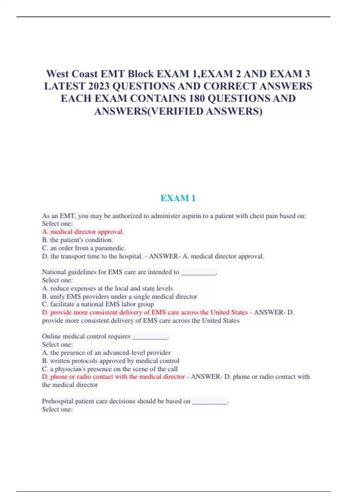 West Coast EMT Block EXAM 1,EXAM 2 AND EXAM 3 LATEST 2023 QUESTIONS AND CORRECT ANSWERS EACH EXAM CONTAINS 180 QUESTIONS AND ANSWERS(VERIFIED ANSWERS) EXAM 1 As an EMT, you may be authorized to administer aspirin to a patient with chest pain based on: Select one: A. medical director approval. B. the patient's condition. C. an order from a paramedic. D. the transport time to the hospital. - ANSWER- A. medical director approval. National guidelines for EMS care are intended to __________. Select one: A. reduce expenses at the local and state levels B. unify EMS providers under a single medical director C. facilitate a national EMS labor group D. provide more consistent delivery of EMS care across the United States - ANSWER- D. provide more consistent delivery of EMS care across the United States Online medical control requires __________. Select one: A. the presence of an advanced-level provider B. written protocols approved by medical control C. a physician's presence on the scene of the call D. phone or radio contact with the medical director - ANSWER- D. phone or radio contact with the medical director Prehospital patient care decisions should be based on __________. Select one: A. the experiences of EMTs B. the opinions of physicians C. an EMS agency's fiscal resources D. EMS research - ANSWER- D. EMS research The ability to handle multiple tasks based on their priority is called __________. Select one: A. patient empathy B. patient advocacy C. integrity D. time management - ANSWER- D. time management The ability to take appropriate action with little direction is known as __________. Select one: A. self-motivation B. diplomacy C. time management D. self-confidence - ANSWER- A. self-motivation The ability to understand others and have them understand you is known as __________. Select one: A. self-confidence B. teamwork and diplomacy C. communication D. scene leadership - ANSWER- C. communication The determination that prompt surgical care in the hospital is more important than performing time-consuming procedures in the field on a major trauma patient is based MOSTLY on: Select one: A. the lead EMT's decision. B. regional trauma guidelines. C. EMS research. D. local protocols. - ANSWER- C. EMS research. The EMT is legally obligated to protect a patient's privacy according to _____________. Select one: A. APGAR B. CQI C. HIPAA D. DCAP - ANSWER- C. HIPAA What is an EMT's primary service area? Select one: A. The only area the EMT is certified to provide patient care B. The main area in which the EMS agency operates C. The area serviced by the EMT's medical director D. The location where the EMT provides essential care during a 9-1-1 call - ANSWER- B. The main area in which the EMS agency operates What should an EMT do to limit errors in the field? Select one: A. Contact medical direction before initiating any treatments. B. Carry an EMT text for reference at all times. C. Follow the agency's written protocols. D. Deviate from established standards when necessary. - ANSWER- C. Follow the agency's written protocols. Which of the following courses requires about 150 hours of training? Select one: A. EMT B. EMR C. AEMT D. Paramedic - ANSWER- A. EMT Which of the following descriptions MOST accurately portrays emergency medical services (EMS)? Select one: A. A team of paramedics and emergency physicians who are responsible for providing emergency care to critically injured patients B. A team of health care professionals who are responsible for providing emergency care and transportation to the sick and injured C. A vast network of advanced life support (ALS) providers who provide definitive emergency care in the prehospital setting D. A system composed exclusively of emergency medical responders (EMRs) and emergency medical technicians (EMTs) who are responsible for providing care to sick and injured patients - ANSWER- B. A team of health care professionals who are responsible for providing emergency care and transportation to the sick and injured Which of the following interventions is used by all levels of EMS providers? Select one: A. Automatic transport ventilators B. Automated external defibrillator C. Needle decompression D. Multilumen airways - ANSWER- B. Automated external defibrillator Which of the following is a specific example of the Mobile Integrated Healthcare (MIH) model? Select one: A. EMTs respond to a woman who complains of high fever B. Paramedics pick up a patient from an acute care clinic C. EMTs assess a patient whose lung disease is "acting up" D. The paramedic administers a patient's flu vaccination - ANSWER- D. The paramedic administers a patient's flu vaccination Which of the following statements regarding the Americans With Disabilities Act (ADA) of 1990 is correct? Select one: A. The minimum number of hours required to successfully complete an EMT course is less for candidates who are disabled. B. According to the ADA, EMT candidates with a documented disability are exempt from taking the NREMT exam. C. The ADA applies only to individuals with a diagnosed and well-documented physical disability. D. The ADA prohibits employers from failing to provide full and equal employment to those who are disabled. - ANSWER- D. The ADA prohibits employers from failing to provide full and equal employment to those who are disabled. Which of the following statements regarding the NREMT is correct? Select one: A. The NREMT is a governmental agency that certifies EMTs. B. EMS training standards are regulated by the NREMT. C. The NREMT is the exclusive certifying body for EMTs. D. The NREMT provides a national standard for EMS testing. - ANSWER- D. The NREMT provides a national standard for EMS testing You are caring for a driver who struck a light pole. She admits to drinking alcohol but orders you not to tell anyone. You should report the information to __________. Select one: a. the state motor vehicle department b. your medical director c. the receiving nurse or doctor d. law enfo