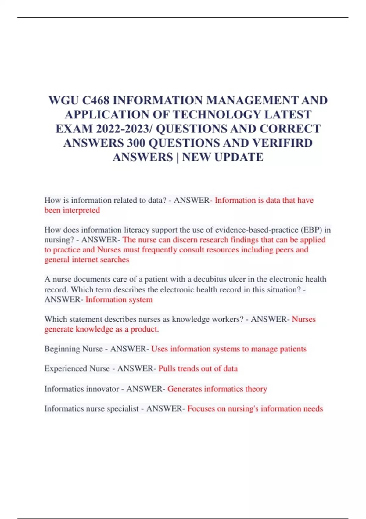 WGU C468 INFORMATION MANAGEMENT AND APPLICATION OF TECHNOLOGY LATEST EXAM / QUESTIONS AND CORRECT ANSWERS 300 QUESTIONS AND VERIFIRD ANSWERS | NEW UPDATE How is information related to data? - ANSWER- Information is data that have been interpreted How does information literacy support the use of evidence-based-practice (EBP) in nursing? - ANSWER- The nurse can discern research findings that can be applied to practice and Nurses must frequently consult resources including peers and general internet searches A nurse documents care of a patient with a decubitus ulcer in the electronic health record. Which term describes the electronic health record in this situation? - ANSWER- Information system Which statement describes nurses as knowledge workers? - ANSWER- Nurses generate knowledge as a product. Beginning Nurse - ANSWER- Uses information systems to manage patients Experienced Nurse - ANSWER- Pulls trends out of data Informatics innovator - ANSWER- Generates informatics theory Informatics nurse specialist - ANSWER- Focuses on nursing's information needs The RN who works in the area of informatics. Has an interest or experience but no formal training. Ensures that information is disseminated at appropriate times for appropriate uses - ANSWER- Informatics Nurse Plays an active role in research and theory development. Has advanced graduate training in nursing informatics. - ANSWER- Informatics Nurse Specialist Which of the following uses database applications to sift through large amounts of data and looks for previously hidden trends? - ANSWER- Data Mining A nurse is reviewing a patient's pneumonia vaccination status in the electronic medical record. The nurse determines the patient needs this vaccine before discharge to meet the requirements of a current clinical pathway. Why would the nurse use information systems in this manner? - ANSWER- To promote desired clinical outcomes A nursing informatics specialist at a small, rural hospital implemented a clinical information system utilizing an electronic health record (EHR). She obtained input from nurses regarding selection of the specific EHR. She noted that some of the nurses had negative attitudes towards a change to the EHR, but she encouraged them to try the system and note its benefits. She implemented the system after all nurses were trained about the EHR. There were numerous complaints about the EHR, which the Nursing Informatics Specialist decided to ignore since the personnel were new to the system. Which barrier to implementing technology is present in the scenario? - ANSWER- Lack of continued support A computer program was implemented at a hospital that required nurses to wait until the patient arrived in the emergency room and was registered into the program before orders for critical time-sensitive treatment could be written. How could this program become a barrier to the nurses attempting to deliver patientcentered care? - ANSWER- The time spent waiting for the program to register the patient could delay critical care being delivered in a timely manner Which national trend is related to nursing informatics? - ANSWER- Barcode scanning for medication administration Which standardized nursing terminology is composed of nursing diagnoses, nursing actions, and nursing outcomes? - ANSWER- ICNP Which of the following requires standardized nursing terminology to meet its criteria? - ANSWER- Meaningful Use What is a challenge to the adoption of eHealth strategies? - ANSWER- Creating economic incentives and policies that providers view as essential to accomplishing their financial and professional goals What is the importance of a nurse's active participation in electronic patient information? - ANSWER- To ensure patient information will be current and accessible to the healthcare team A nurse is working on a medical surgical unit and is concerned over a patient's worsening heart failure. The nurse calls the provider to discuss the assessments. How does the electronic medical record facilitate a collaborative discussion in this situation? - ANSWER- The provider can visualize the chest x-ray remotely.. The provider has access to the data being discussed. What are three types of clinical information systems? - ANSWER- Laboratory system. Order entry system. Monitoring system. What are common features of the various health information systems? - ANSWER- Creates a comprehensive record of the patient's medical history. Is unique in the way they function and provide information to clinicians. Collects, processes and distributes patient centered data to manage and provide care. Administrative Information Systems - ANSWER- Admission, discharge, and transfer system. Financial system. Scheduling system Clinical Information Systems - ANSWER- Radiology information system. Clinical documentation system.
