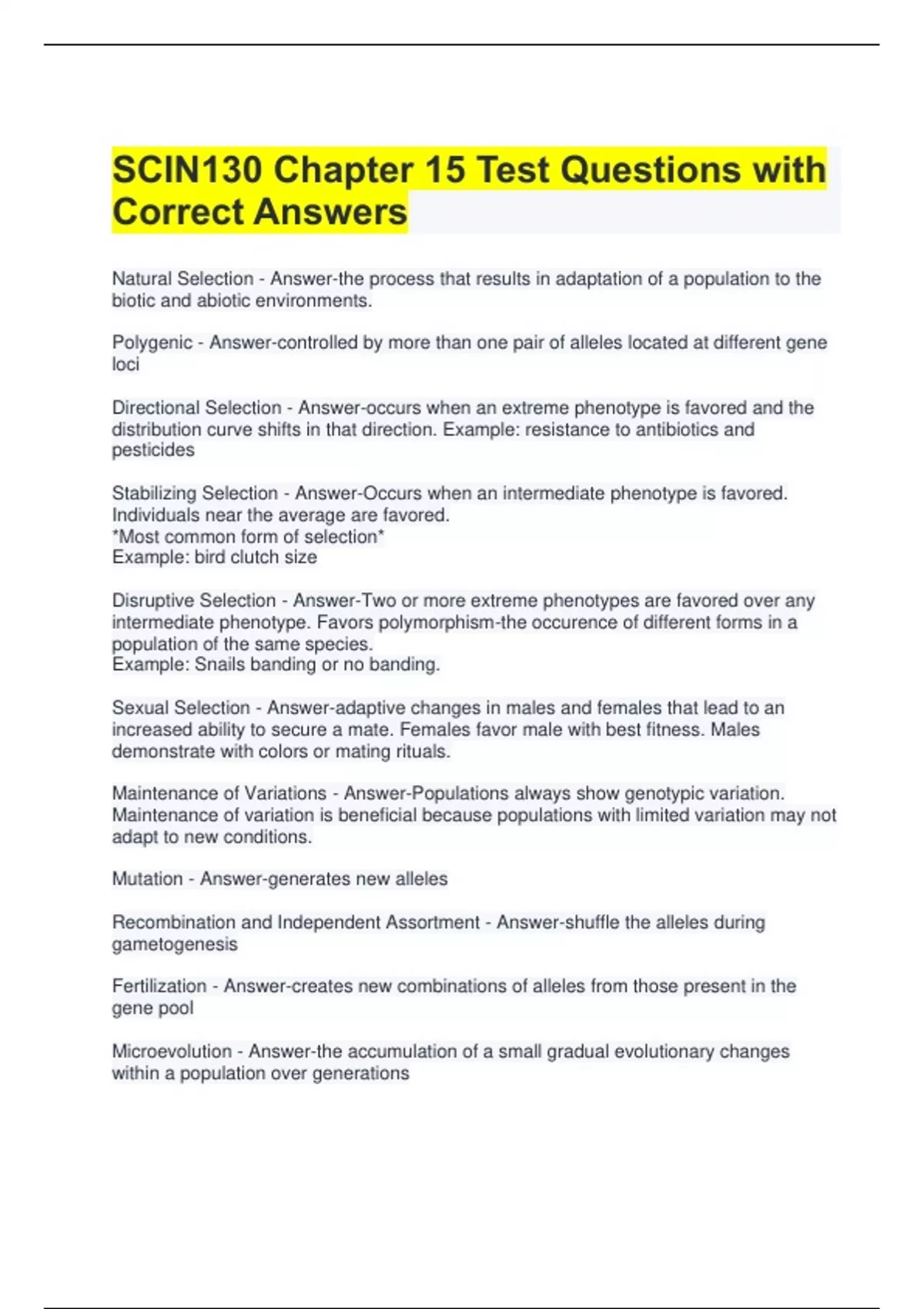 SCIN130 Chapter 15 Test Questions with Correct Answers Natural Selection - Answer-the process that results in adaptation of a population to the biotic and abiotic environments. Polygenic - Answer-controlled by more than one pair of alleles located at different gene loci Directional Selection - Answer-occurs when an extreme phenotype is favored and the distribution curve shifts in that direction. Example: resistance to antibiotics and pesticides Stabilizing Selection - Answer-Occurs when an intermediate phenotype is favored. Individuals near the average are favored. *Most common form of selection* Example: bird clutch size Disruptive Selection - Answer-Two or more extreme phenotypes are favored over any intermediate phenotype. Favors polymorphism-the occurence of different forms in a population of the same species. Example: Snails banding or no banding. Sexual Selection - Answer-adaptive changes in males and females that lead to an increased ability to secure a mate. Females favor male with best fitness. Males demonstrate with colors or mating rituals. Maintenance of Variations - Answer-Populations always show genotypic variation. Maintenance of variation is beneficial because populations with limited variation may not adapt to new conditions. Mutation - Answer-generates new alleles Recombination and Independent Assortment - Answer-shuffle the alleles during gametogenesis Fertilization - Answer-creates new combinations of alleles from those present in the gene pool Microevolution - Answer-the accumulation of a small gradual evolutionary changes within a population over generations
