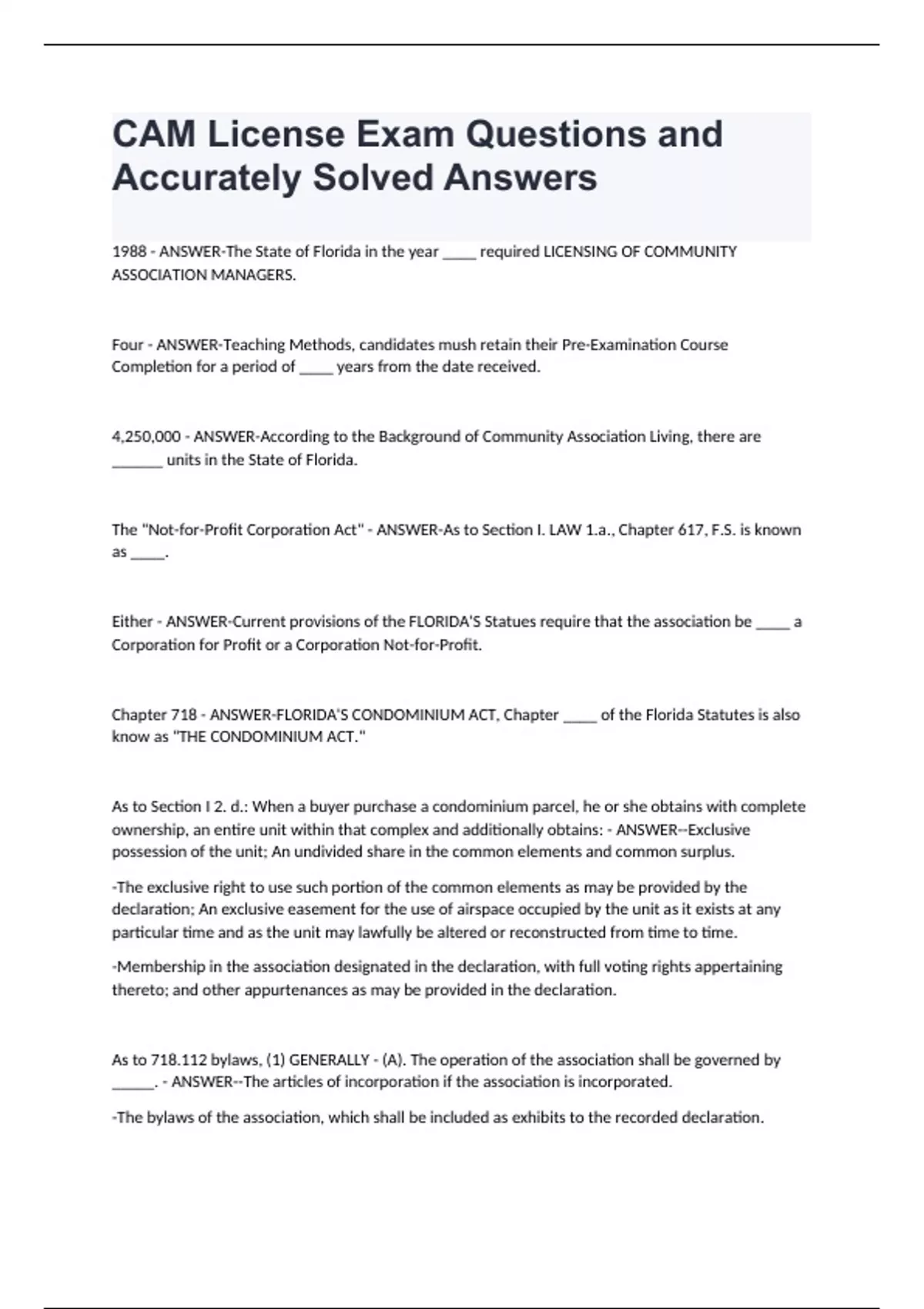 1988 - ANSWER-The State of Florida in the year ____ required LICENSING OF COMMUNITY ASSOCIATION MANAGERS. Four - ANSWER-Teaching Methods, candidates mush retain their Pre-Examination Course Completion for a period of ____ years from the date received. 4,250,000 - ANSWER-According to the Background of Community Association Living, there are ______ units in the State of Florida. The "Not-for-Profit Corporation Act" - ANSWER-As to Section I. LAW 1.a., Chapter 617, F.S. is known as ____. Either - ANSWER-Current provisions of the FLORIDA'S Statues require that the association be ____ a Corporation for Profit or a Corporation Not-for-Profit. Chapter 718 - ANSWER-FLORIDA'S CONDOMINIUM ACT, Chapter ____ of the Florida Statutes is also know as "THE CONDOMINIUM ACT." As to Section I 2. d.: When a buyer purchase a condominium parcel, he or she obtains with complete ownership, an entire unit within that complex and additionally obtains: - ANSWER--Exclusive possession of the unit; An undivided share in the common elements and common surplus. -The exclusive right to use such portion of the common elements as may be provided by the declaration; An exclusive easement for the use of airspace occupied by the unit as it exists at any particular time and as the unit may lawfully be altered or reconstructed from time to time. -Membership in the association designated in the declaration, with full voting rights appertaining thereto; and other appurtenances as may be provided in the declaration. As to 718.112 bylaws, (1) GENERALLY - (A). The operation of the association shall be governed by _____. - ANSWER--The articles of incorporation if the association is incorporated. -The bylaws of the association, which shall be included as exhibits to the recorded declaration