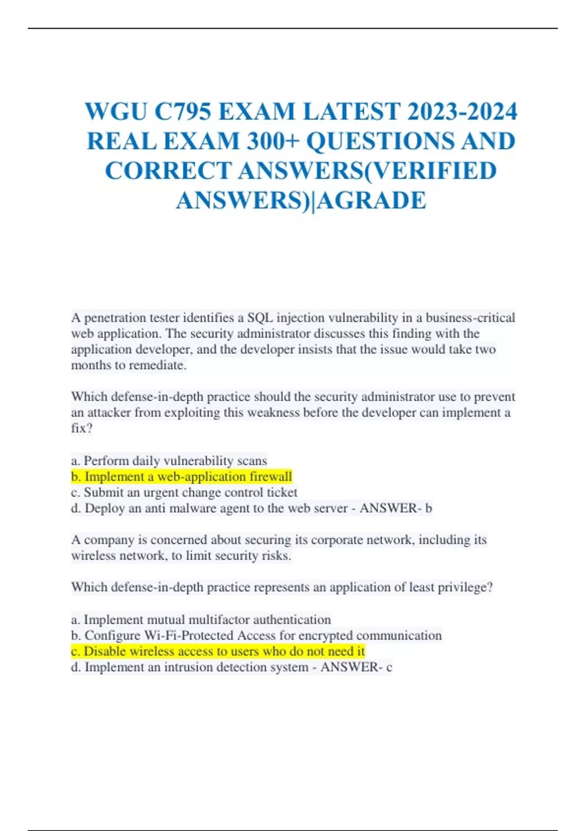 WGU C795 EXAM LATEST REAL EXAM 300+ QUESTIONS AND CORRECT ANSWERS(VERIFIED ANSWERS)|AGRADE