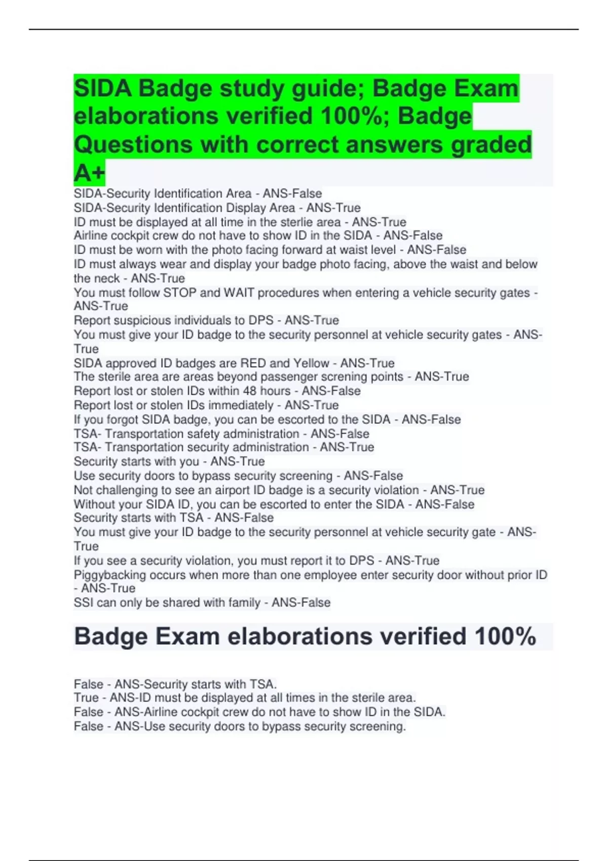 SIDA Badge study guide; Badge Exam elaborations verified 100%; Badge Questions with correct answers graded A+ SIDA-Security Identification Area - ANS-False SIDA-Security Identification Display Area - ANS-True ID must be displayed at all time in the sterlie area - ANS-True Airline cockpit crew do not have to show ID in the SIDA - ANS-False ID must be worn with the photo facing forward at waist level - ANS-False ID must always wear and display your badge photo facing, above the waist and below the neck - ANS-True You must follow STOP and WAIT procedures when entering a vehicle security gates - ANS-True Report suspicious individuals to DPS - ANS-True You must give your ID badge to the security personnel at vehicle security gates - ANS-True SIDA approved ID badges Badge Exam elaborations verified 100% False - ANS-Security starts with TSA. True - ANS-ID must be displayed at all times in the sterile area. False - ANS-Airline cockpit crew do not have to show ID in the SIDA. False - ANS-Use security doors to bypass security screening Badge Questions with correct answers graded A+ Who is the Airport Operator? - ANS-Massport Name 2 of the many types of badges generated at the Massport Badge Office at Logan - ANS-SIDA Badge , TVP , PSID Badge There are 3 very important phone numbers on the back of your badge. Name 2 of the angencies and departments listed. - ANS-Massport ops/ door alarms. State police main number. Massport Medical Emergency What does S.I.D.A stand for? - ANS-Security, Identification, Display, Area Where and when must you wear your badge? - ANS-Where: Outermost garment , Readily visible , Between the neck and waist. When: At all times in the SIDA area (beyond the security check points) Name 3 organizations and/ or people involved in the security of Logan Airport. - ANS-You, the employee State Police Massport TSA *All (tenants and cotractors) doing buissness at Logan What should you do if you see an unattended or suspicious item on the airport grounds? - ANS-Do not touch