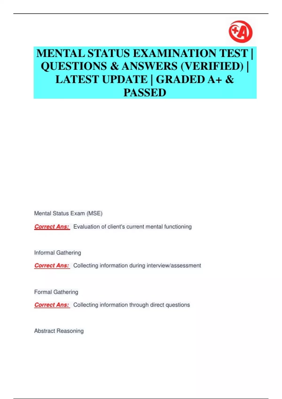 MENTAL STATUS EXAMINATION TEST | QUESTIONS & ANSWERS (VERIFIED) | LATEST UPDATE | GRADED A+ & PASSEDMENTAL STATUS EXAMINATION TEST | QUESTIONS & ANSWERS (VERIFIED) | LATEST UPDATE | GRADED A+ & PASSED