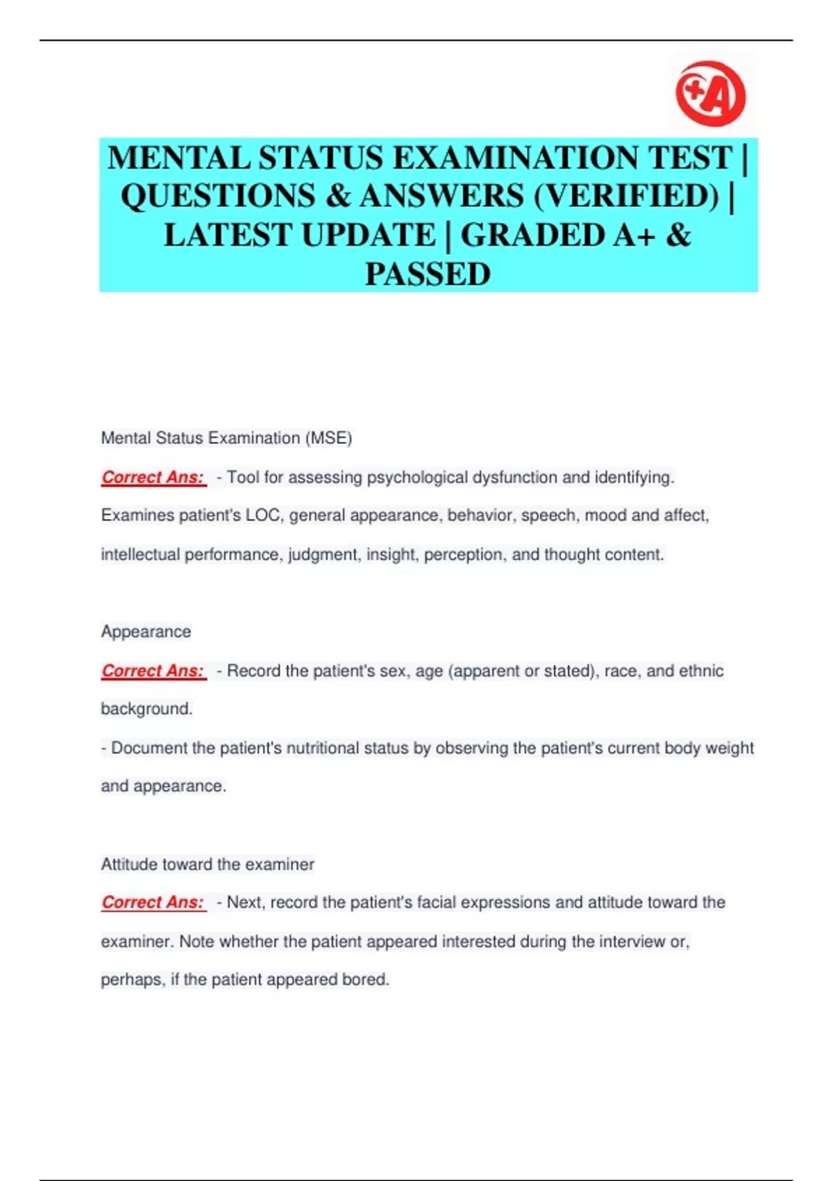 MENTAL STATUS EXAMINATION TEST | QUESTIONS & ANSWERS (VERIFIED) | LATEST UPDATE | GRADED A+ & PASSEDMENTAL STATUS EXAMINATION TEST | QUESTIONS & ANSWERS (VERIFIED) | LATEST UPDATE | GRADED A+ & PASSEDMENTAL STATUS EXAMINATION TEST | QUESTIONS & ANSWERS (VERIFIED) | LATEST UPDATE | GRADED A+ & PASSED