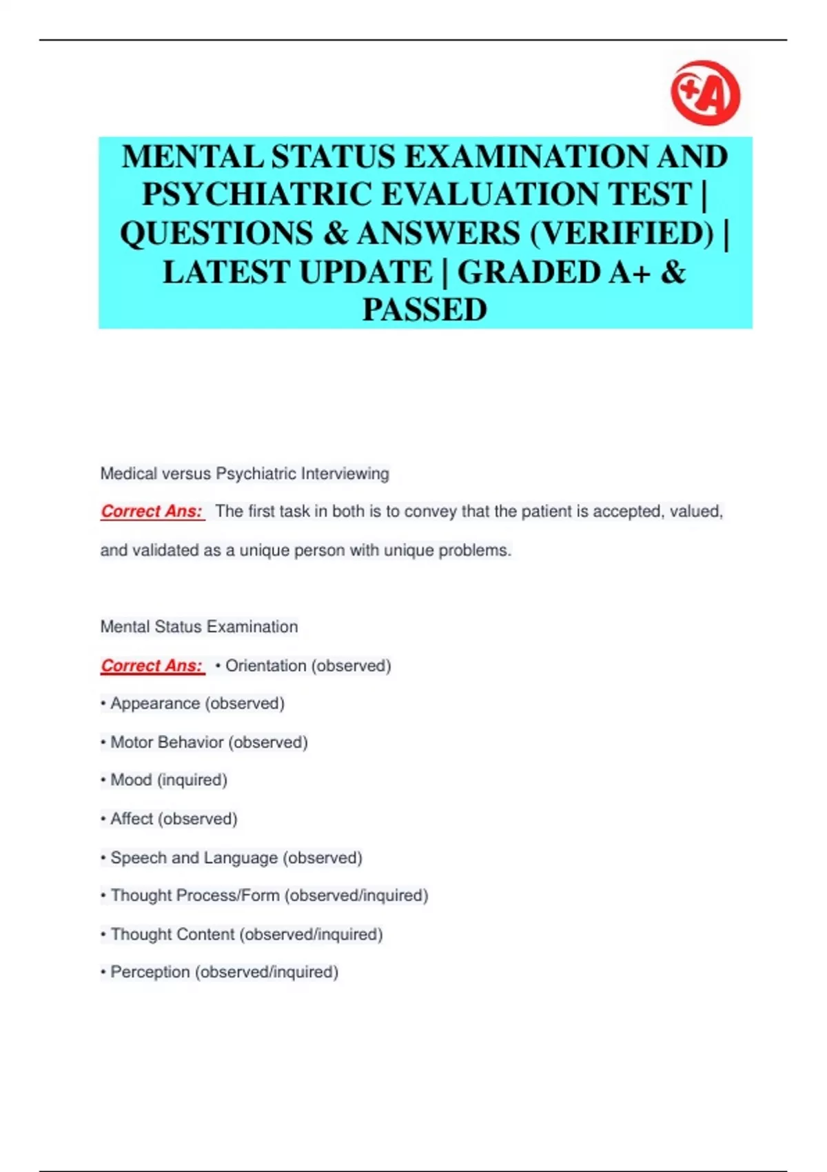 MENTAL STATUS EXAMINATION AND PSYCHIATRIC EVALUATION TEST | QUESTIONS & ANSWERS (VERIFIED) | LATEST UPDATE | GRADED A+ & PASSEDMENTAL STATUS EXAMINATION AND PSYCHIATRIC EVALUATION TEST | QUESTIONS & ANSWERS (VERIFIED) | LATEST UPDATE | GRADED A+ & PASSED