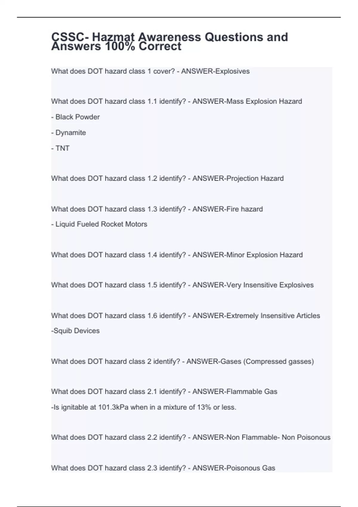 What does DOT hazard class 1 cover? - ANSWER-Explosives What does DOT hazard class 1.1 identify? - ANSWER-Mass Explosion Hazard - Black Powder - Dynamite - TNT What does DOT hazard class 1.2 identify? - ANSWER-Projection Hazard What does DOT hazard class 1.3 identify? - ANSWER-Fire hazard - Liquid Fueled Rocket Motors What does DOT hazard class 1.4 identify? - ANSWER-Minor Explosion Hazard What does DOT hazard class 1.5 identify? - ANSWER-Very Insensitive Explosives What does DOT hazard class 1.6 identify? - ANSWER-Extremely Insensitive Articles -Squib Devices What does DOT hazard class 2 identify? - ANSWER-Gases (Compressed gasses) What does DOT hazard class 2.1 identify? - ANSWER-Flammable Gas -Is ignitable at 101.3kPa when in a mixture of 13% or less. What does DOT hazard class 2.2 identify? - ANSWER-Non Flammable- Non Poisonous What does DOT hazard class 2.3 identify? - ANSWER-Poisonous Gas