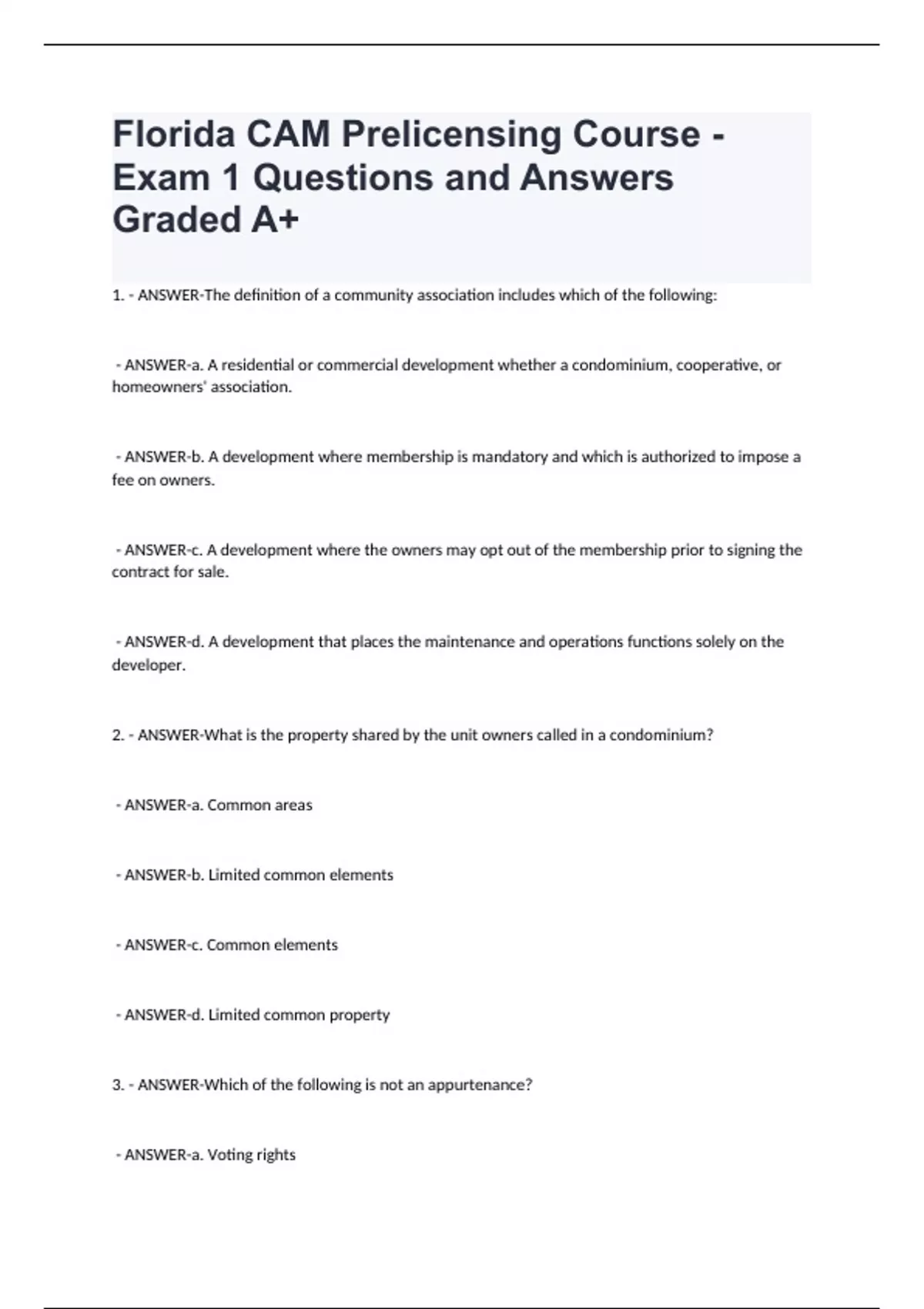 1. - ANSWER-The definition of a community association includes which of the following: - ANSWER-a. A residential or commercial development whether a condominium, cooperative, or homeowners' association. - ANSWER-b. A development where membership is mandatory and which is authorized to impose a fee on owners. - ANSWER-c. A development where the owners may opt out of the membership prior to signing the contract for sale. - ANSWER-d. A development that places the maintenance and operations functions solely on the developer. 2. - ANSWER-What is the property shared by the unit owners called in a condominium? - ANSWER-a. Common areas - ANSWER-b. Limited common elements - ANSWER-c. Common elements - ANSWER-d. Limited common property 3. - ANSWER-Which of the following is not an appurtenance? - ANSWER-a. Voting rights - ANSWER-b. Membership in the corporation