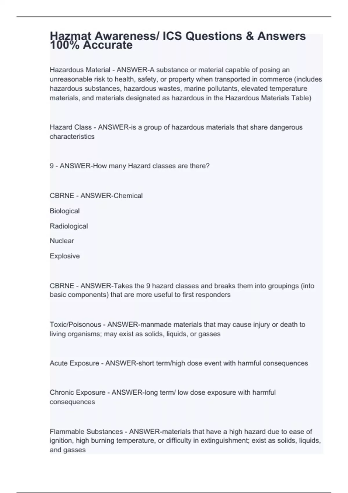 Hazardous Material - ANSWER-A substance or material capable of posing an unreasonable risk to health, safety, or property when transported in commerce (includes hazardous substances, hazardous wastes, marine pollutants, elevated temperature materials, and materials designated as hazardous in the Hazardous Materials Table) Hazard Class - ANSWER-is a group of hazardous materials that share dangerous characteristics 9 - ANSWER-How many Hazard classes are there? CBRNE - ANSWER-Chemical Biological Radiological Nuclear Explosive CBRNE - ANSWER-Takes the 9 hazard classes and breaks them into groupings (into basic components) that are more useful to first responders Toxic/Poisonous - ANSWER-manmade materials that may cause injury or death to living organisms; may exist as solids, liquids, or gasses Acute Exposure - ANSWER-short term/high dose event with harmful consequences Chronic Exposure - ANSWER-long term/ low dose exposure with harmful consequences