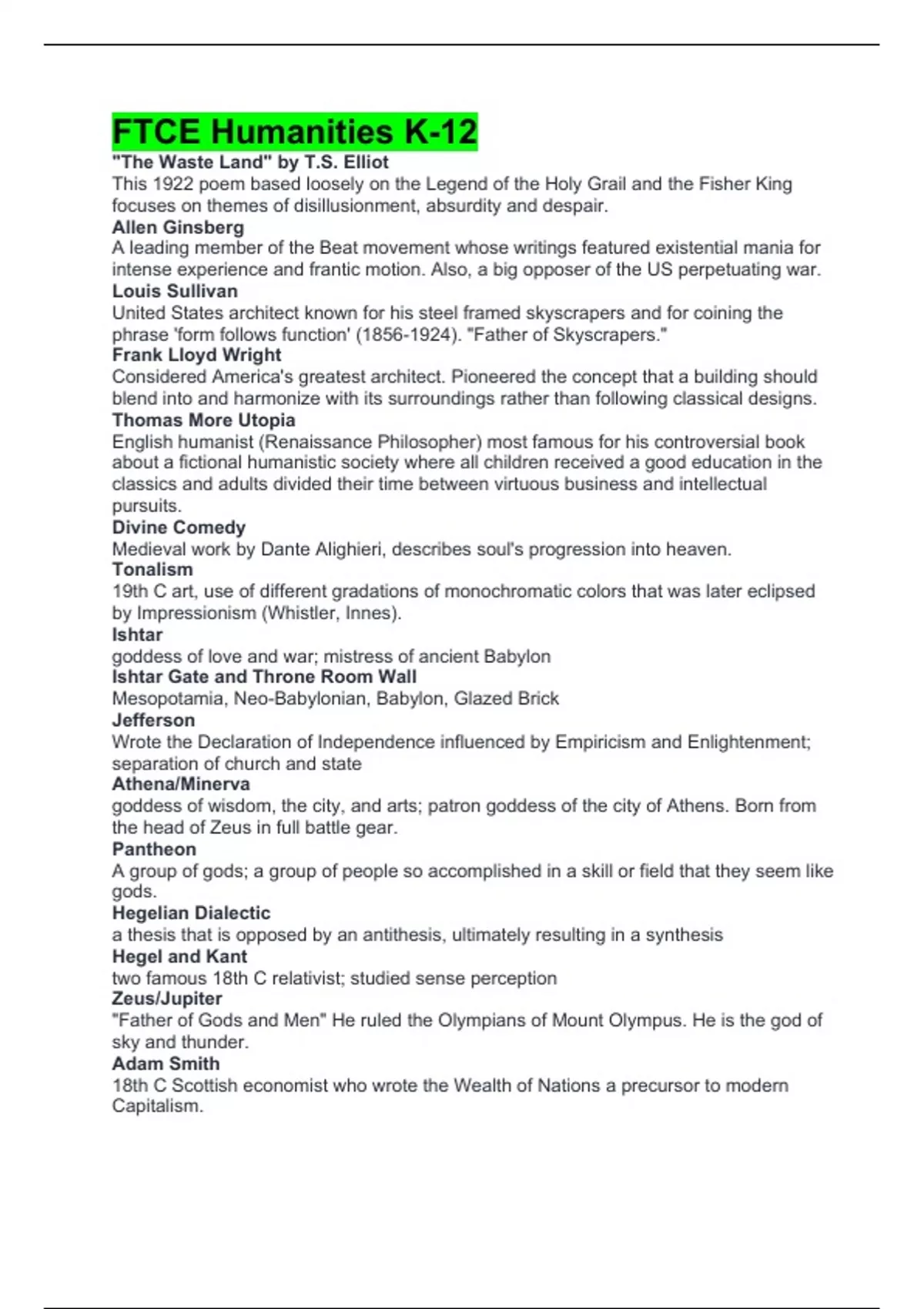 FTCE Humanities K-12 "The Waste Land" by T.S. Elliot This 1922 poem based loosely on the Legend of the Holy Grail and the Fisher King focuses on themes of disillusionment, absurdity and despair. Allen Ginsberg A leading member of the Beat movement whose writings featured existential mania for intense experience and frantic motion. Also, a big opposer of the US perpetuating war. Louis Sullivan United States architect known for his steel framed skyscrapers and for coining the phrase 'form follows function' (). "Father of Skyscrapers." Frank Lloyd Wright Considered America's greatest architect. Pioneered the concept that a building should blend into and harmonize with its surroundings rather than following classical designs. Thomas More Utopia English humanist (Renaissance Philosopher) most famous for his controversial book about a fictional humanistic society where all children received a good education in the classics and adults divided their time between virtuous business and intellectual pursuits. Divine Comedy Medieval work by Dante Alighieri, describes soul's progression into heaven. Tonalism 19th C art, use of different gradations of monochromatic colors that was later eclipsed by Impressionism (Whistler, Innes). Ishtar goddess of love and war; mistress of ancient Babylon Ishtar Gate and Throne Room Wall Mesopotamia, Neo-Babylonian, Babylon, Glazed Brick Jefferson Wrote the Declaration of Independence influenced by Empiricism and Enlightenment; separation of church and state Athena/Minerva goddess of wisdom, the city, and arts; patron goddess of the city of Athens. Born from the head of Zeus in full battle gear. Pantheon A group of gods; a group of people so accomplished in a skill or field that they seem like gods. Hegelian Dialectic a thesis that is opposed by an antithesis, ultimately resulting in a synthesis Hegel and Kant two famous 18th C relativist; studied sense perception Zeus/Jupiter "Father of Gods and Men" He ruled the Olympians of Mount Olympus. He is the god of sky and thunder. Adam Smith 18th C Scottish economist who wrote the Wealth of Nations a precursor to modern Capitalism. Tuscan Order Renaissance architecture featuring slender, smooth columns that sit on simple bases; no carvings on the frieze or in the capitals Composite Order Renaissance combination of Ionic and Corinthian orders, capital combines acanthus leaves with volute scrolls Gaea goddess of the earth in ancient Greek mythology Montiesquieu "Defined structures of government" theory helped US Founding Fathers distinguish the notions of monarchy, republic and despotism Talcott Parsons () His social action theory viewed choices as things made based on cultural values and social structures, not by psychological processes Sleeping Beauty Tchaikovsky ballet of 1890 adapted from 1697 Charles Perrault fairy tale. Rene Descartes () French philosopher that argued for dualism between mind and body: "I think, therefore, I am." Dualism mind and body are separate (Descartes) Apollo god of music, poetry, prophecy, and medicine Maslow Humanist psychologist who developed a pyramid representing heirarchy of human needs. "Self-actualization" Principa Mathematica (1687) Included Newton's three laws of motion that laid the framework for modern physics Klimt Art Nouveau "The Kiss" Art Nouveau a style of decorative art, architecture, and design prominent in western Europe and the US from about 1890 until World War I and characterized by intricate linear designs and flowing curves based on natural forms. Art Deco Descended from Art Nouveau, this movement of the 1920s and 1930s sought to upgrade industrial design in competition with "fine art" and to work new materials into decorative patterns that could be either machined or handcrafted. Characterized by streamlined, elongated, and symmetrical design. Byzantine Art The eastern part of the Roman Empire that remained after the fall of Rome. Art focuses on Spiritual not naturalism. Romanesque style architectural style of medieval Europe, characterized by semi-circular arches, massive quality, thick walls, round arches, sturdy piers, groin vaults, large towers, decorative arcading. Crossed England from France. Gothic Architecture Architecture of the twelfth-century Europe, featuring stained-glass windows, flying buttresses, tall spires, and pointed arches Hestia/Vesta Goddess of hearth and home. Eldest sister of Zeus. John Maynard Keynes () he was the most influential economic critic of the Treaty of Versailles. He'd taken part in the peace conference but resigned in disgust when he saw the direction it was taking. His book "The Economic Consequences of the Peace" was a scathing attack, especially on reparations and the other economic aspects of the peace. He argued that the Treaty was immoral and unworkable and that such a peace would bring economic ruin and war to Europe unless it was repudiated. 17th Amendment (1913) Direct election of senators Baroque Period the stylistic period between approximately 1600 and 1750 began with opera invention died with Bach chromatic scale makes use of all twelve pitches, equally divided, within the octave diatonic scale consists of seven whole and half steps whose patterns form major and minor scales Nefertiti queen of Egypt and wife of Akhenaton (14th century BC); religious revolution resulting in monotheism Akhenaten early ruler of Egypt who rejected the old gods and replaced them with Aten, the sun god. Voltaire () championed the enlightened principles of reason, progress, toleration, and individual liberty; contributed massively to french enlightenment French Enlightenment Philosophical movement that sought to improve society through reason and science; formally began in 1685 Tenuto Hold the note for its full value Cubism An Artistic movement that focused on geometric shapes, complex lines, and overlapping planes. crescendo steadily increasing in volume or force Georgia O'Keeffe a founder of American modernism who focused on unrealistic repr