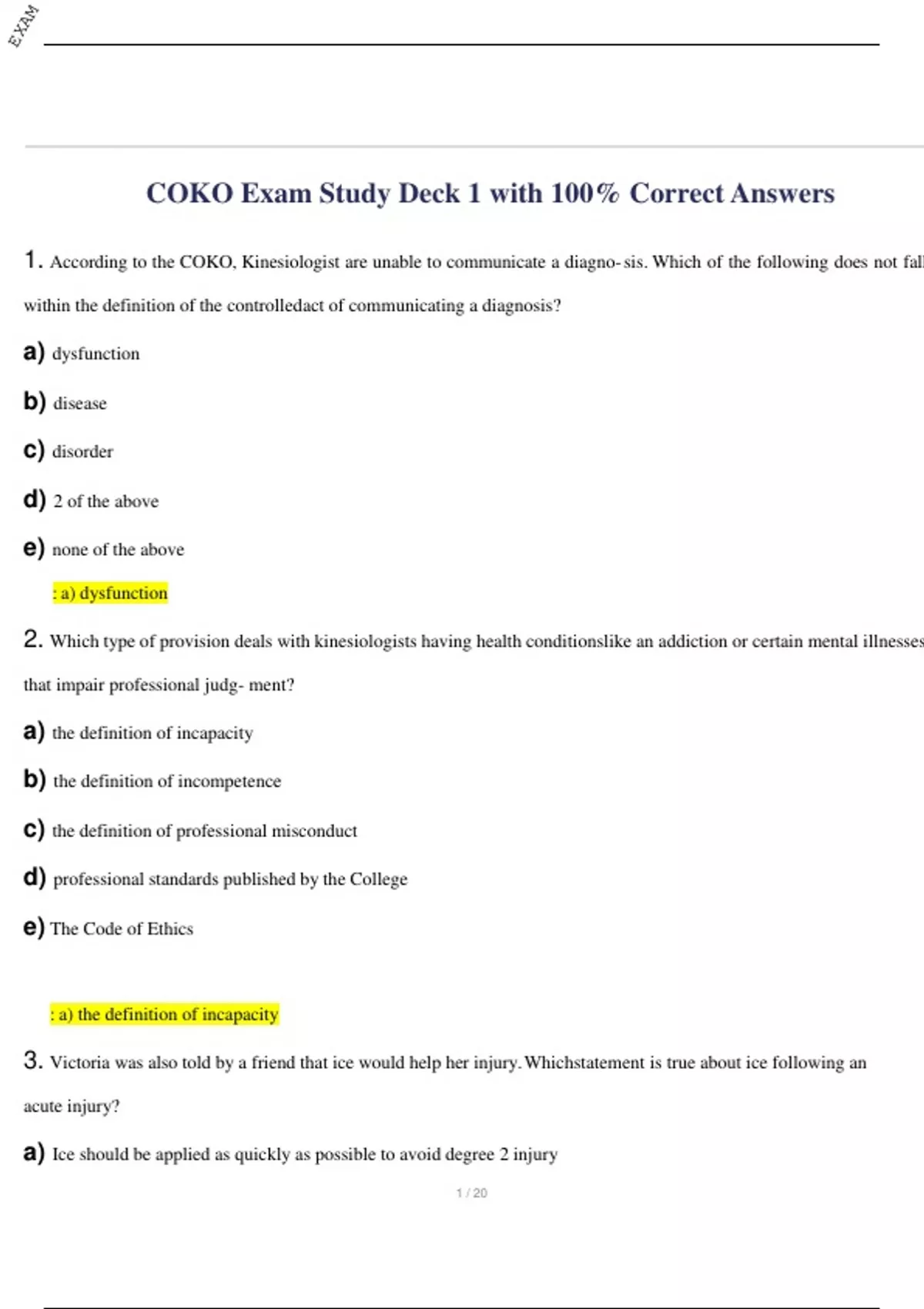 According to the COKO, Kinesiologist are unable to communicate a diagno- sis.Which of the following does not fall within the definition of the controlledact of communicating a diagnosis? a) dysfunction b) disease c) disorder d) 2 of the above e) none of the above : a) dysfunction 2. Which type of provision deals with kinesiologists having health conditionslike an addiction or certain mental illnesses that impair professional judg- ment? a) the definition of incapacity b) the definition of incompetence c) the definition of professional misconduct d) professional standards published by the College e) The Code of Ethics : a) the definition of incapacity 3. Victoria was also told by a friend that ice would help her injury.Whichstatement is true about ice following an acute injury? a) Ice should be applied as quickly as possible to avoid degree 2 injury EXAM 2 / 20 b) Ice is applied directly to the skin rather than through a towel c) Ice can decrease metabolism so that swelling will decrease over time d) a & c e) all of the above : d) a &c (ice should be applied immediately; can decrease metabolism) 4. What is 'light PA'? 5. : Light PA is...aerobic activity that causes a barely noticeable change in breathing, involving increased depth more than rate. Can be sustained by an untrained individual for 60 mins or more 6. What is 'moderate PA'? : Moderate PA is...aerobic activity that can be performed at a ventilatory demand that allows carrying on a conversation (talk test). Can be sustained by untrained individual for 30 - 60 mins. 7. What is 'vigorous PA'? : Vigorous PA is...aerobic activity that is demanding of ventilation that talking cannot be maintained during activity. Untrained individual can sustain for 20 - 30 mins. 8. What is 'high PA'? : High PA is...aerobic or combination activity. Can be sustained only briefly, typically less than 10 mins 9. What are the 4 areas of intensity ventilatory symptomatology (light, moder- ate, vigorous, high)? EXAM