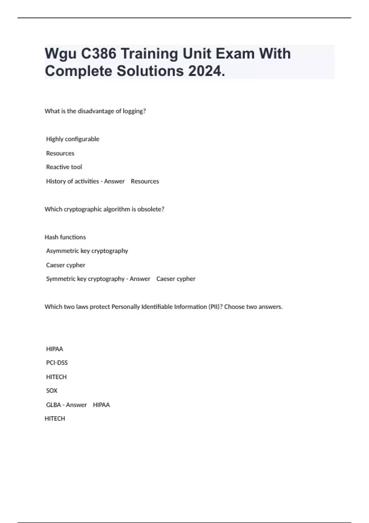 What is the disadvantage of logging? Highly configurable Resources Reactive tool History of activities - Answer Resources Which cryptographic algorithm is obsolete? Hash functions Asymmetric key cryptography Caeser cypher Symmetric key cryptography - Answer Caeser cypher Which two laws protect Personally Identifiable Information (PII)? Choose two answers. HIPAA PCI-DSS HITECH SOX GLBA - Answer HIPAA HITECH