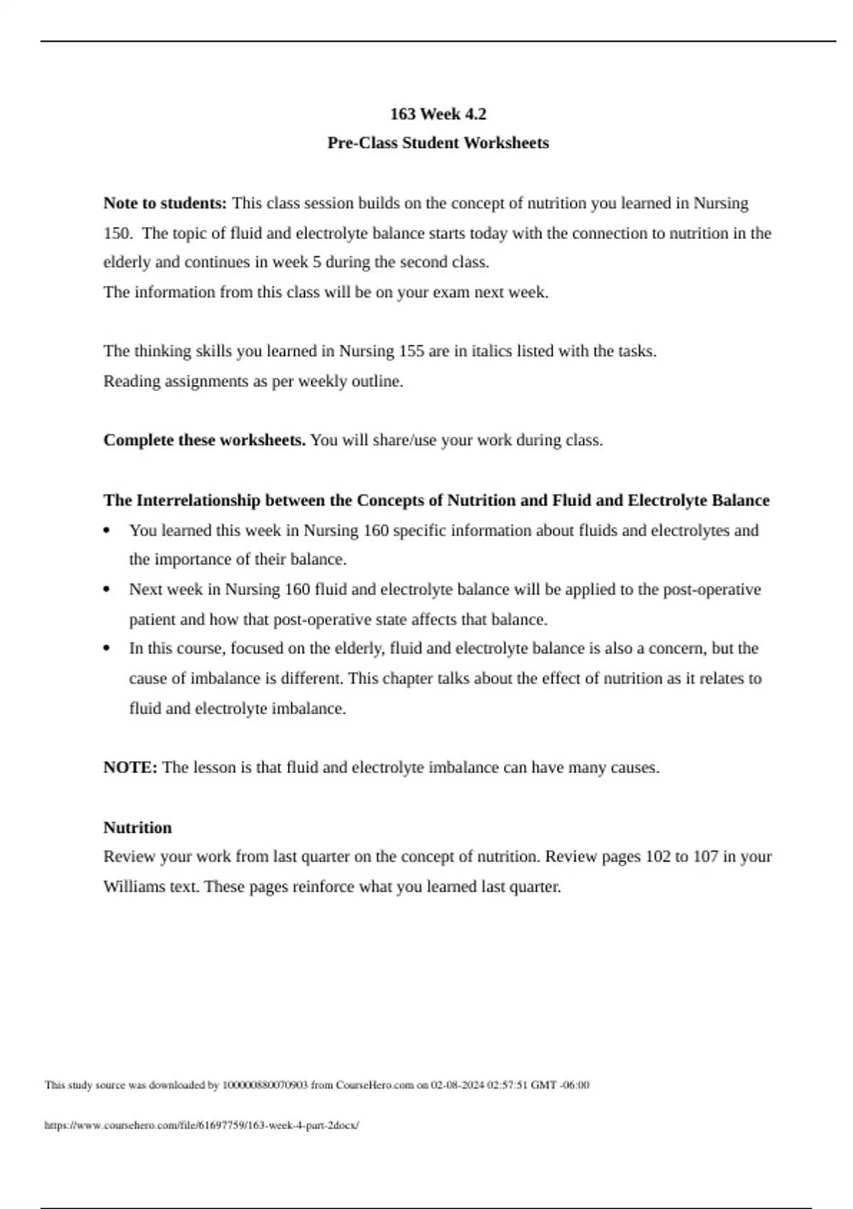 163 Week 4.2 Pre-Class Student Worksheets Note to students: This class session builds on the concept of nutrition you learned in Nursing 150. The topic of fluid and electrolyte balance starts today with the connection to nutrition in the elderly and continues in week 5 during the second class. The information from this class will be on your exam next week. The thinking skills you learned in Nursing 155 are in italics listed with the tasks. Reading assignments as per weekly outline. Complete these worksheets. You will share/use your work during class. The Interrelationship between the Concepts of Nutrition and Fluid and Electrolyte Balance You learned this week in Nursing 160 specific information about fluids and electrolytes and the importance of their balance. Next week in Nursing 160 fluid and electrolyte balance will be applied to the post-operative patient and how that post-operative state affects that balance. In this course, focused on the elderly, fluid and electrolyte balance is also a concern, but the cause of imbalance is different. This chapter talks about the effect of nutrition as it relates to fluid and electrolyte imbalance