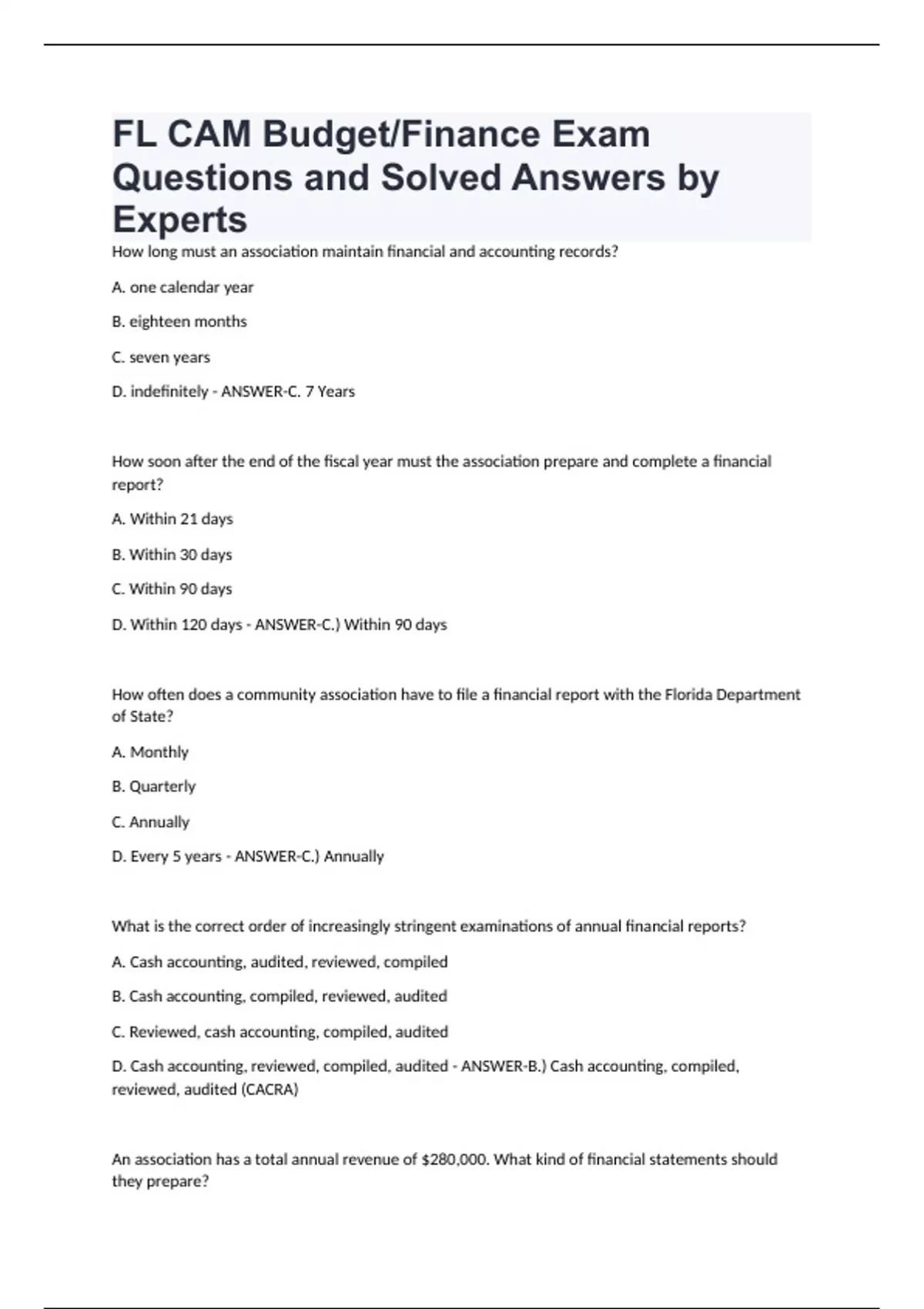 How long must an association maintain financial and accounting records? A. one calendar year B. eighteen months C. seven years D. indefinitely - ANSWER-C. 7 Years How soon after the end of the fiscal year must the association prepare and complete a financial report? A. Within 21 days B. Within 30 days C. Within 90 days D. Within 120 days - ANSWER-C.) Within 90 days How often does a community association have to file a financial report with the Florida Department of State? A. Monthly B. Quarterly C. Annually D. Every 5 years - ANSWER-C.) Annually What is the correct order of increasingly stringent examinations of annual financial reports? A. Cash accounting, audited, reviewed, compiled B. Cash accounting, compiled, reviewed, audited C. Reviewed, cash accounting, compiled, audited D. Cash accounting, reviewed, compiled, audited - ANSWER-B.) Cash accounting, compiled, reviewed, audited (CACRA) An association has a total annual revenue of $280,000. What kind of financial statements should they prepare? A. Reviewed