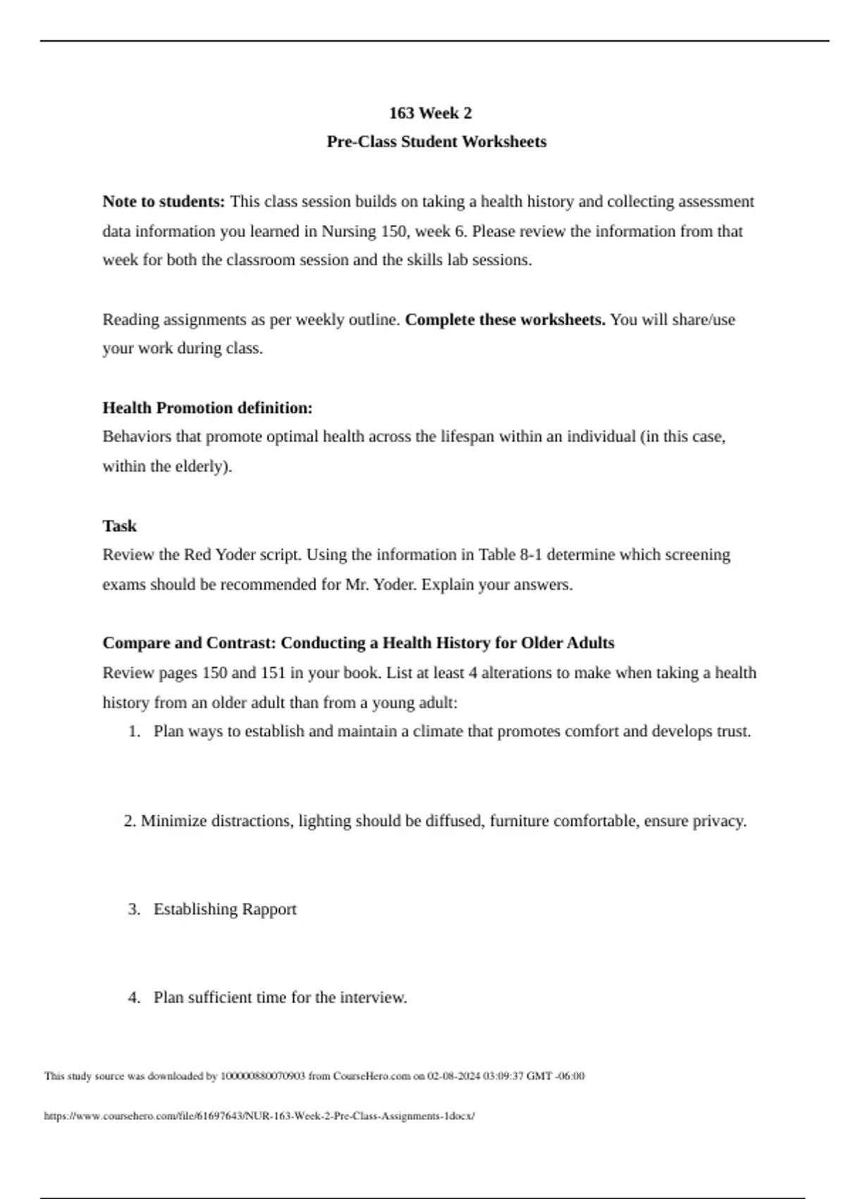 163 Week 2 Pre-Class Student Worksheets Note to students: This class session builds on taking a health history and collecting assessment data information you learned in Nursing 150, week 6. Please review the information from that week for both the classroom session and the skills lab sessions. Reading assignments as per weekly outline. Complete these worksheets. You will share/use your work during class. Health Promotion definition: Behaviors that promote optimal health across the lifespan within an individual (in this case, within the elderly). Task Review the Red Yoder script. Using the information in Table 8-1 determine which screening exams should be recommended for Mr. Yoder. Explain your answers. Compare and Contrast: Conducting a Health History for Older Adults Review pages 150 and 151 in your book. List at least 4 alterations to make when taking a health history from an older adult than from a young adult: 1. Plan ways to establish and maintain a climate that promotes comfort and develops trust. 2. Minimize distractions, lighting should be diffused, furniture comfortable, ensure privacy.