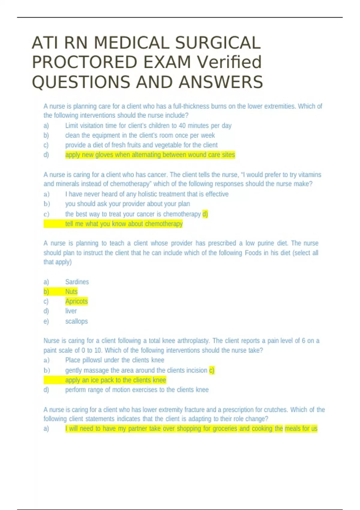 ATI RN MEDICAL SURGICAL PROCTORED EXAM Verified QUESTIONS AND ANSWERS A nurse is planning care for a client who has a full-thickness burns on the lower extremities. Which of the following interventions should the nurse include? a) Limit visitation time for client’s children to 40 minutes per day b) clean the equipment in the client's room once per week c) provide a diet of fresh fruits and vegetable for the client d) apply new gloves when alternating between wound care sites A nurse is caring for a client who has cancer. The client tells the nurse, “I would prefer to try vitamins and minerals instead of chemotherapy” which of the following responses should the nurse make? a) I have never heard of any holistic treatment that is effective b) you should ask your provider about your plan c) the best way to treat your cancer is chemotherapy d) tell me what you know about chemotherapy