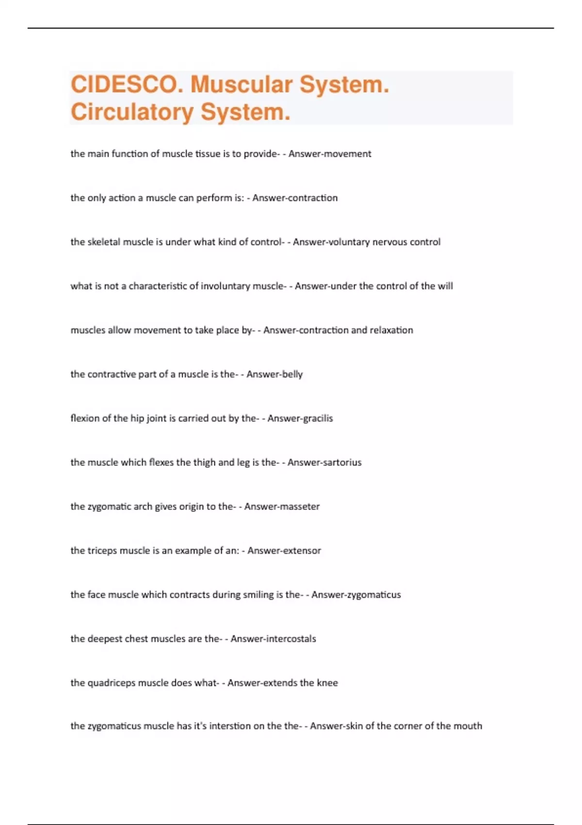 the main function of muscle tissue is to provide- - Answer-movement the only action a muscle can perform is: - Answer-contraction the skeletal muscle is under what kind of control- - Answer-voluntary nervous control what is not a characteristic of involuntary muscle- - Answer-under the control of the will muscles allow movement to take place by- - Answer-contraction and relaxation the contractive part of a muscle is the- - Answer-belly flexion of the hip joint is carried out by the- - Answer-gracilis the muscle which flexes the thigh and leg is the- - Answer-sartorius the zygomatic arch gives origin to the- - Answer-masseter the triceps muscle is an example of an: - Answer-extensor the face muscle which contracts during smiling is the- - Answer-zygomaticus the deepest chest muscles are the- - Answer-intercostals the quadriceps muscle does what- - Answer-extends the knee the zygomaticus muscle has it's interstion on the the- - Answer-skin of the corner of the mouththe muscle which totally covers the should-joint is the- - Answer-deltoid the muscle that lifts the leg in the hip joint is the- - Answer-rectus femoris a muscle that pulls up the corner of the mouth is the- - Answer-zygomaticus the normal temperature of the human body is- - Answer-37 C/98.6 F what is NOT present in tissue fluid: - Answer-red blood cells
