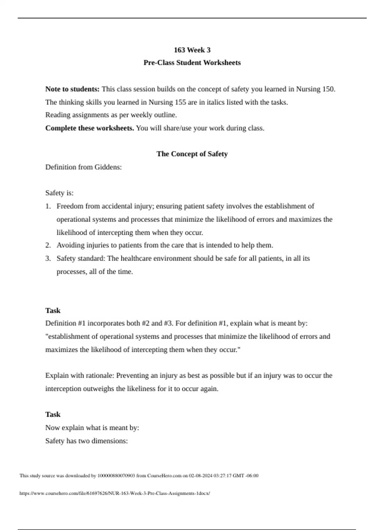 163 Week 3 Pre-Class Student Worksheets Note to students: This class session builds on the concept of safety you learned in Nursing 150. The thinking skills you learned in Nursing 155 are in italics listed with the tasks. Reading assignments as per weekly outline. Complete these worksheets. You will share/use your work during class. The Concept of Safety Definition from Giddens: Safety is: 1. Freedom from accidental injury; ensuring patient safety involves the establishment of operational systems and processes that minimize the likelihood of errors and maximizes the likelihood of intercepting them when they occur. 2. Avoiding injuries to patients from the care that is intended to help them. 3. Safety standard: The healthcare environment should be safe for all patients, in all its processes, all of the time. Task Definition #1 incorporates both #2 and #3. For definition #1, explain what is meant by: "establishment of operational systems and processes that minimize the likelihood of errors and maximizes the likelihood of intercepting them when they occur." Explain with rationale: Preventing an injury as best as possible but if an injury was to occur the interception outweighs the likeliness for it to occur again. Task Now explain what is meant by: Safety has two dimensions: