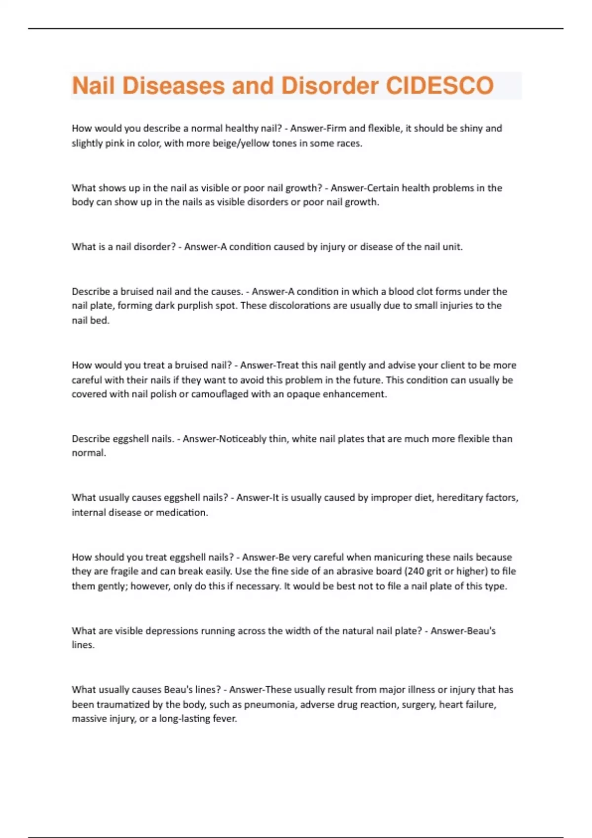 How would you describe a normal healthy nail? - Answer-Firm and flexible, it should be shiny and slightly pink in color, with more beige/yellow tones in some races. What shows up in the nail as visible or poor nail growth? - Answer-Certain health problems in the body can show up in the nails as visible disorders or poor nail growth. What is a nail disorder? - Answer-A condition caused by injury or disease of the nail unit. Describe a bruised nail and the causes. - Answer-A condition in which a blood clot forms under the nail plate, forming dark purplish spot. These discolorations are usually due to small injuries to the nail bed. How would you treat a bruised nail? - Answer-Treat this nail gently and advise your client to be more careful with their nails if they want to avoid this problem in the future. This condition can usually be covered with nail polish or camouflaged with an opaque enhancement. Describe eggshell nails. - Answer-Noticeably thin, white nail plates that are much more flexible than normal. What usually causes eggshell nails? - Answer-It is usually caused by improper diet, hereditary factors, internal disease or medication. How should you treat eggshell nails? - Answer-Be very careful when manicuring these nails because they are fragile and can break easily. Use the fine side of an abrasive board (240 grit or higher) to file them gently; however, only do this if necessary. It would be best not to file a nail plate of this type. What are visible depressions running across the width of the natural nail plate? - Answer-Beau's lines. What usually causes Beau's lines? - Answer-These usually result from major illness or injury that has been traumatized by the body, such as pneumonia, adverse drug reaction, surgery, heart failure, massive injury, or a long-lasting fever.How should we handle hangnails if there is no sign of infection or open wound? - Answer-Advise the client that proper nail care- such as hot oil manicures or use of a skin conditioning lotion or oil- can aid in correcting such condition. When would it NOT be recommended to handle a hangnail? - Answer-If signs of infection or open wounds are presents. Is it TRUE or FALSE that Leukonychia spots are caused by a vitamin or mineral deficiency. - AnswerFalse