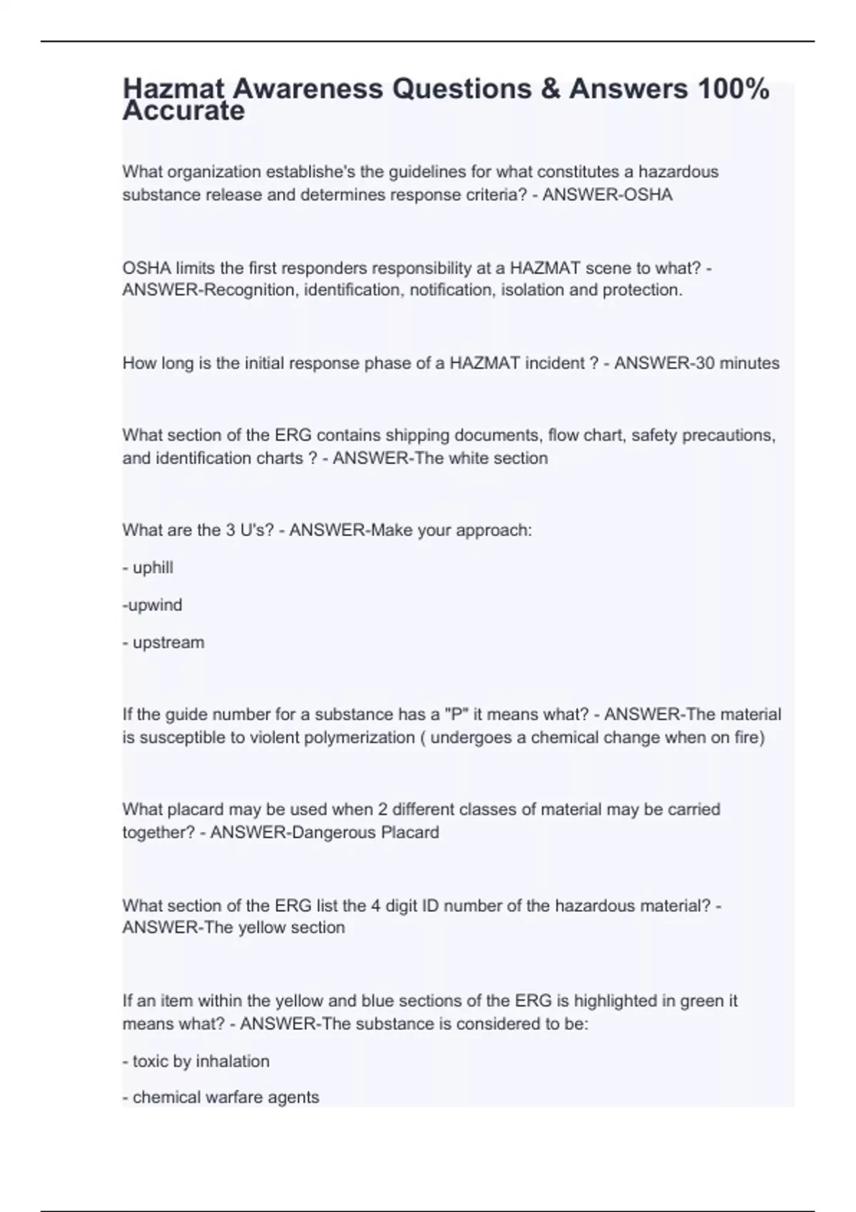 What organization establishe's the guidelines for what constitutes a hazardous substance release and determines response criteria? - ANSWER-OSHA OSHA limits the first responders responsibility at a HAZMAT scene to what? - ANSWER-Recognition, identification, notification, isolation and protection. How long is the initial response phase of a HAZMAT incident ? - ANSWER-30 minutes What section of the ERG contains shipping documents, flow chart, safety precautions, and identification charts ? - ANSWER-The white section What are the 3 U's? - ANSWER-Make your approach: - uphill -upwind - upstream If the guide number for a substance has a "P" it means what? - ANSWER-The material is susceptible to violent polymerization ( undergoes a chemical change when on fire) What placard may be used when 2 different classes of material may be carried together? - ANSWER-Dangerous Placard What section of the ERG list the 4 digit ID number of the hazardous material? - ANSWER-The yellow section If an item within the yellow and blue sections of the ERG is highlighted in green it means what? - ANSWER-The substance is considered to be: - toxic by inhalation - chemical warfare agents - produces toxic gas when exposed to water ( weaponizable)