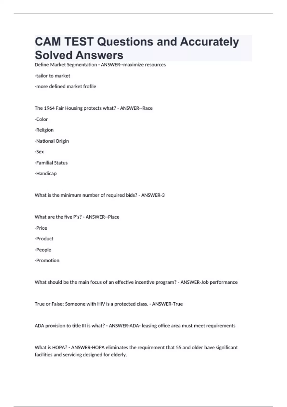 Define Market Segmentation - ANSWER--maximize resources -tailor to market -more defined market frofile The 1964 Fair Housing protects what? - ANSWER--Race -Color -Religion -National Origin -Sex -Familial Status -Handicap What is the minimum number of required bids? - ANSWER-3 What are the five P's? - ANSWER--Place -Price -Product -People -Promotion What should be the main focus of an effective incentive program? - ANSWER-Job performance True or False: Someone with HIV is a protected class. - ANSWER-True ADA provision to title III is what? - ANSWER-ADA- leasing office area must meet requirements What is HOPA? - ANSWER-HOPA eliminates the requirement that 55 and older have significant facilities and servicing designed for elderly. What year was HOPA established? - ANSWER-1995