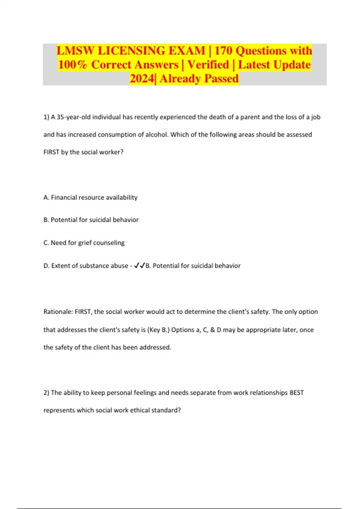 1) A 35-year-old individual has recently experienced the death of a parent and the loss of a job and has increased consumption of alcohol. Which of the following areas should be assessed FIRST by the social worker? A. Financial resource availability B. Potential for suicidal behavior C. Need for grief counseling D. Extent of substance abuse - B. Potential for suicidal behavior Rationale: FIRST, the social worker would act to determine the client's safety. The only option that addresses the client's safety is (Key B.) Options a, C, & D may be appropriate later, once the safety of the client has been addressed.