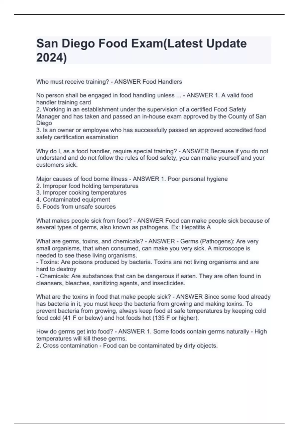 Who must receive training? - ANSWER Food Handlers No person shall be engaged in food handling unless ... - ANSWER 1. A valid food handler training card 2. Working in an establishment under the supervision of a certified Food Safety Manager and has taken and passed an in-house exam approved by the County of San Diego 3. Is an owner or employee who has successfully passed an approved accredited food safety certification examination Why do I, as a food handler, require special training? - ANSWER Because if you do not understand and do not follow the rules of food safety, you can make yourself and your customers sick. Major causes of food borne illness - ANSWER 1. Poor personal hygiene 2. Improper food holding temperatures 3. Improper cooking temperatures 4. Contaminated equipment 5. Foods from unsafe sources What makes people sick from food? - ANSWER Food can make people sick because of several types of germs, also known as pathogens. Ex: Hepatitis A What are germs, toxins, and chemicals? - ANSWER - Germs (Pathogens): Are very small organisms, that when consumed, can make you very sick. A microscope is needed to see these living organisms. - Toxins: Are poisons produced by bacteria. Toxins are not living organisms and are hard to destroy - Chemicals: Are substances that can be dangerous if eaten. They are often found in cleansers, bleaches, sanitizing agents, and insecticides. What are the toxins in food that make people sick? -
