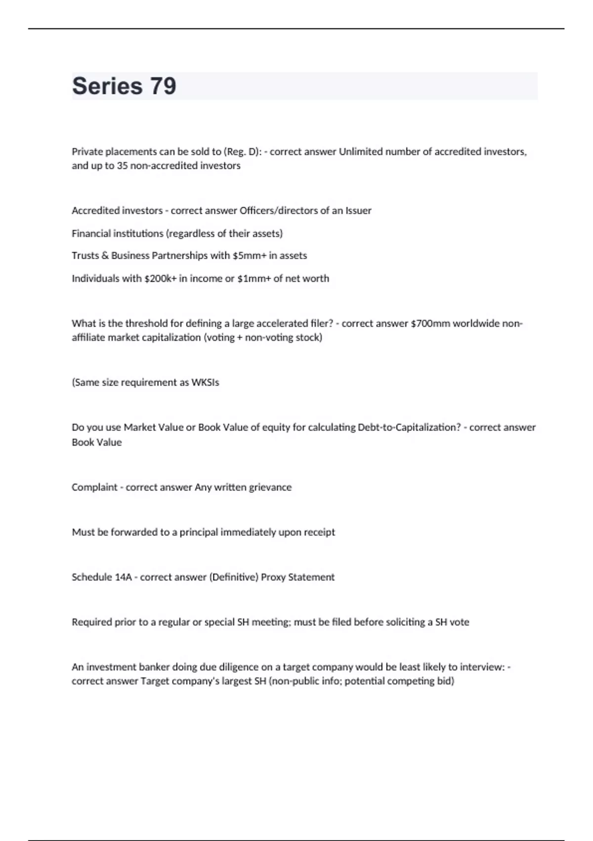 Series 79 Private placements can be sold to (Reg. D): - correct answer Unlimited number of accredited investors, and up to 35 non-accredited investors Accredited investors - correct answer Officers/directors of an Issuer Financial institutions (regardless of their assets) Trusts & Business Partnerships with $5mm+ in assets Individuals with $200k+ in income or $1mm+ of net worth What is the threshold for defining a large accelerated filer? - correct answer $700mm worldwide non-affiliate market capitalization (voting + non-voting stock) (Same size requirement as WKSIs Do you use Market Value or Book Value of equity for calculating Debt-to-Capitalization? - correct answer Book Value Complaint - correct answer Any written grievance Must be forwarded to a principal immediately upon receipt Schedule 14A - correct answer (Definitive) Proxy Statement Required prior to a regular or special SH meeting; must be filed before soliciting a SH vote An investment banker doing due diligence on a target company would be least likely to interview: - correct answer Target company's largest SH (non-public info; potential competing bid)