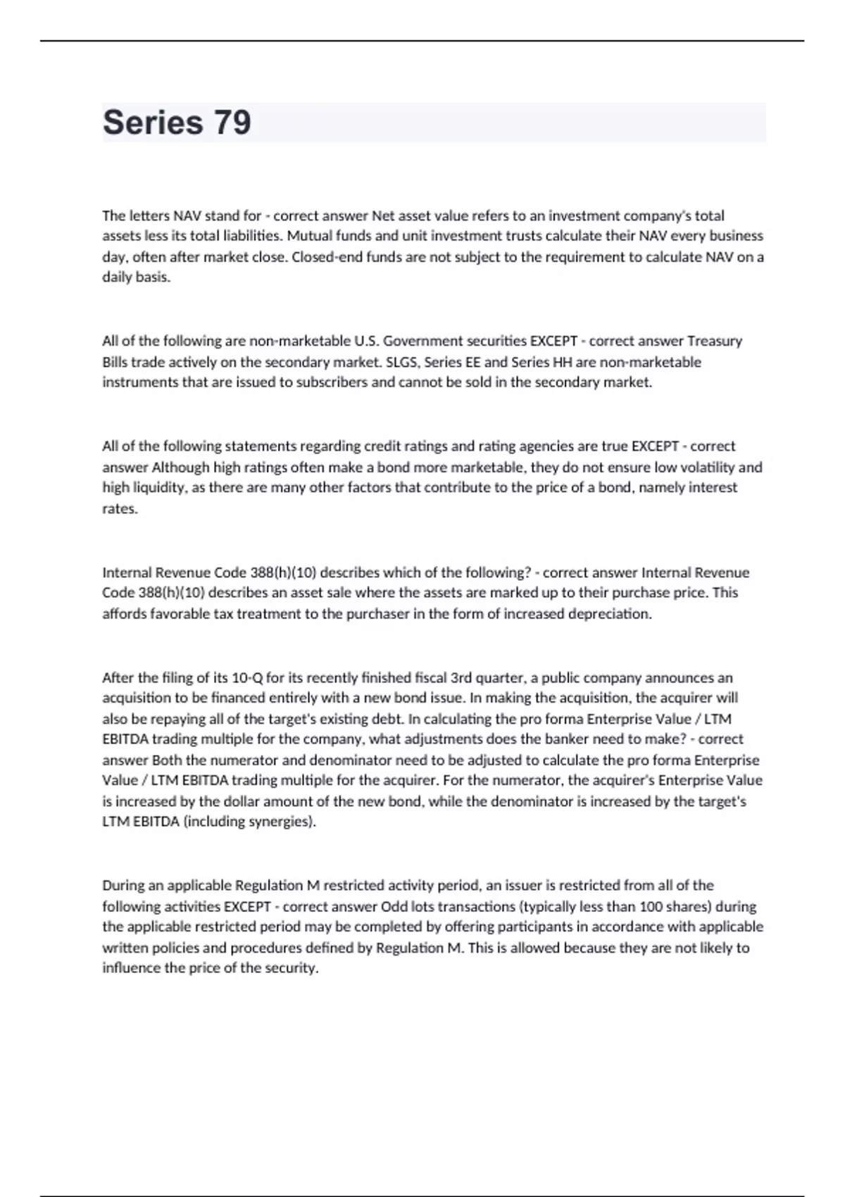 Series 79 The letters NAV stand for - correct answer Net asset value refers to an investment company's total assets less its total liabilities. Mutual funds and unit investment trusts calculate their NAV every business day, often after market close. Closed-end funds are not subject to the requirement to calculate NAV on a daily basis. All of the following are non-marketable U.S. Government securities EXCEPT - correct answer Treasury Bills trade actively on the secondary market. SLGS, Series EE and Series HH are non-marketable instruments that are issued to subscribers and cannot be sold in the secondary market. All of the following statements regarding credit ratings and rating agencies are true EXCEPT - correct answer Although high ratings often make a bond more marketable, they do not ensure low volatility and high liquidity, as there are many other factors that contribute to the price of a bond, namely interest rates. Internal Revenue Code 388(h)(10) describes which of the following? - correct answer Internal Revenue Code 388(h)(10) describes an asset sale where the assets are marked up to their purchase price. This affords favorable tax treatment to the purchaser in the form of increased depreciation. After the filing of its 10-Q for its recently finished fiscal 3rd quarter, a public company announces an acquisition to be financed entirely with a new bond issue. In making the acquisition, the acquirer will also be repaying all of the target's existing debt. In calculating the pro forma Enterprise Value / LTM EBITDA trading multiple for the company, what adjustments does the banker need to make? - correct answer Both the numerator and denominator need to be adjusted to calculate the pro forma Enterprise Value / LTM EBITDA trading multiple for the acquirer. For the numerator, the acquirer's Enterprise Value is increased by the dollar amount of the new bond, while the denominator is increased by the target's LTM EBITDA (including synergies). During an applicable Regulation M restricted activity period, an issuer is restricted from all of the following activities EXCEPT - correct answer Odd lots transactions (typically less than 100 shares) during the applicable restricted period may be completed by offering participants in accordance with applicable written policies and procedures defined by Regulation M. This is allowed because they are not likely to influence the price of the security.