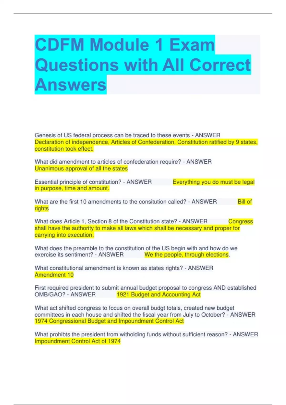 CDFM Module 1 Exam Questions with All Correct Answers Genesis of US federal process can be traced to these events - ANSWER Declaration of independence, Articles of Confederation, Constitution ratified by 9 states, constitution took effect. What did amendment to articles of confederation require? - ANSWER Unanimous approval of all the states Essential principle of constitution? - ANSWER Everything you do must be legal in purpose, time and amount. What are the first 10 amendments to the consitution called? - ANSWER Bill of rights What does Article 1, Section 8 of the Constitution state? - ANSWER Congress shall have the authority to make all laws which shall be necessary and proper for carrying into execution. What does the preamble to the constitution of the US begin with and how do we exercise its sentiment? - ANSWER We the people, through elections. What constitutional amendment is known as states rights? - ANSWER Amendment 10 First required president to submit annual budget proposal to congress AND established OMB/GAO? - ANSWER 1921 Budget and Accounting Act What act shifted congress to focus on overall budgt totals, created new budget committees in each house and shifted the fiscal year from July to October? - ANSWER 1974 Congressional Budget and Impoundment Control Act