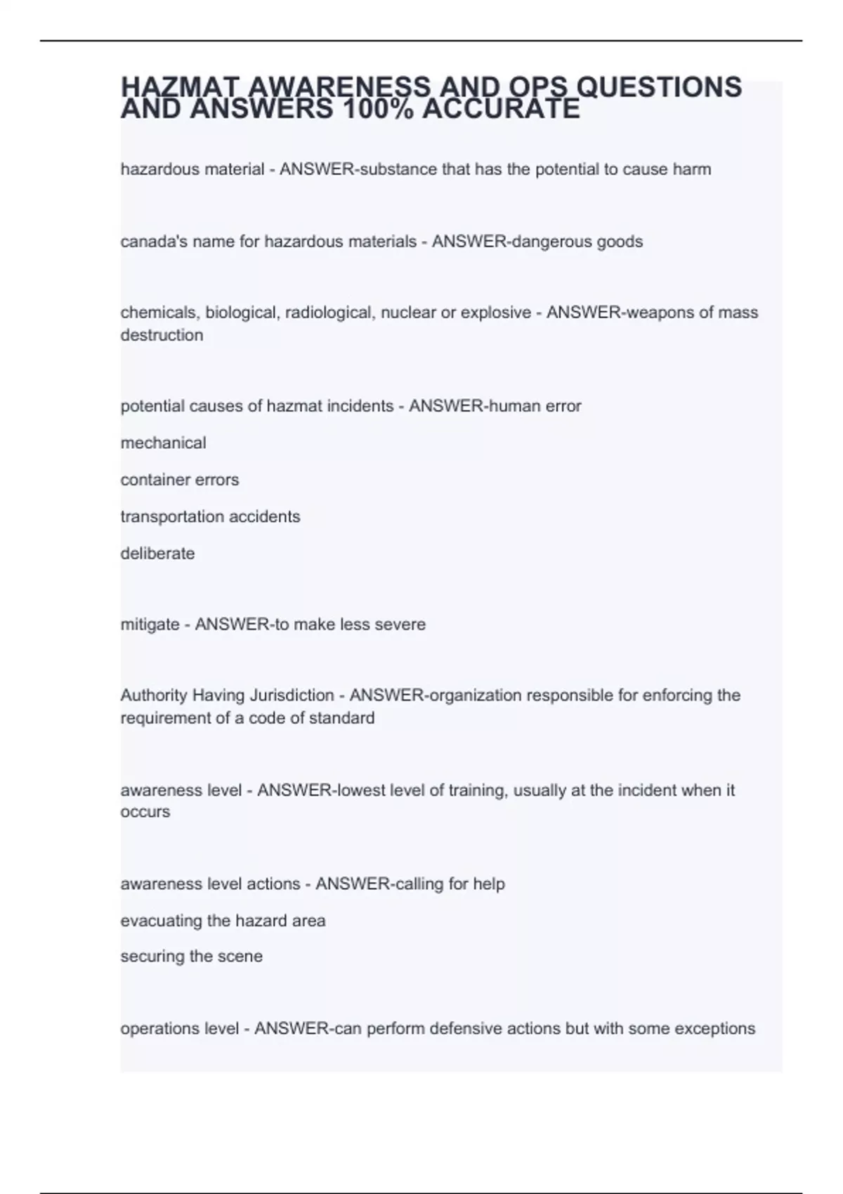 hazardous material - ANSWER-substance that has the potential to cause harm canada's name for hazardous materials - ANSWER-dangerous goods chemicals, biological, radiological, nuclear or explosive - ANSWER-weapons of mass destruction potential causes of hazmat incidents - ANSWER-human error mechanical container errors transportation accidents deliberate mitigate - ANSWER-to make less severe Authority Having Jurisdiction - ANSWER-organization responsible for enforcing the requirement of a code of standard awareness level - ANSWER-lowest level of training, usually at the incident when it occurs awareness level actions - ANSWER-calling for help evacuating the hazard area securing the scene operations level - ANSWER-can perform defensive actions but with some exceptions when doffing PPE, what is the last item that should be removed - ANSWER-respirator facepiece
