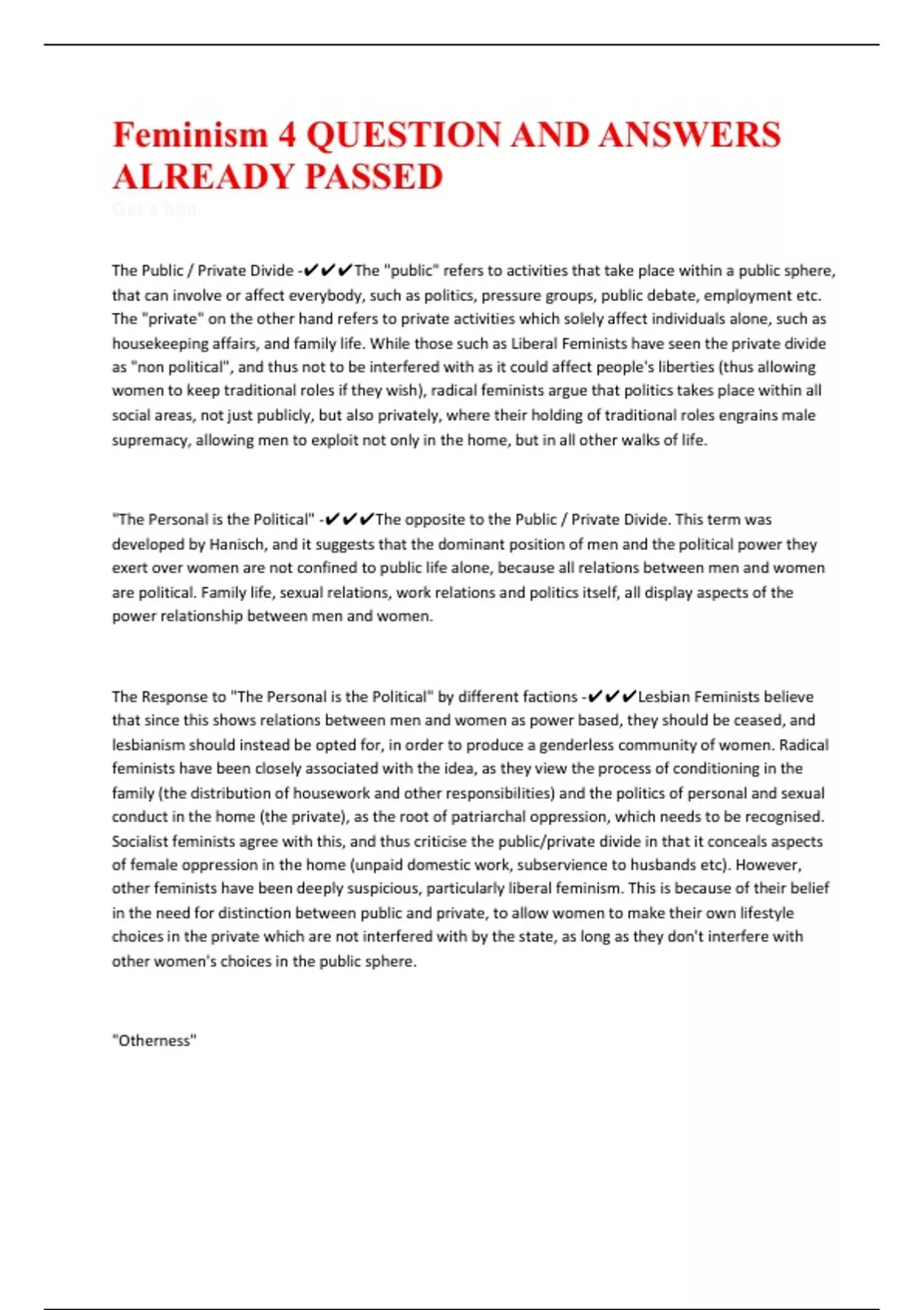 Feminism 4 QUESTION AND ANSWERS ALREADY PASSED