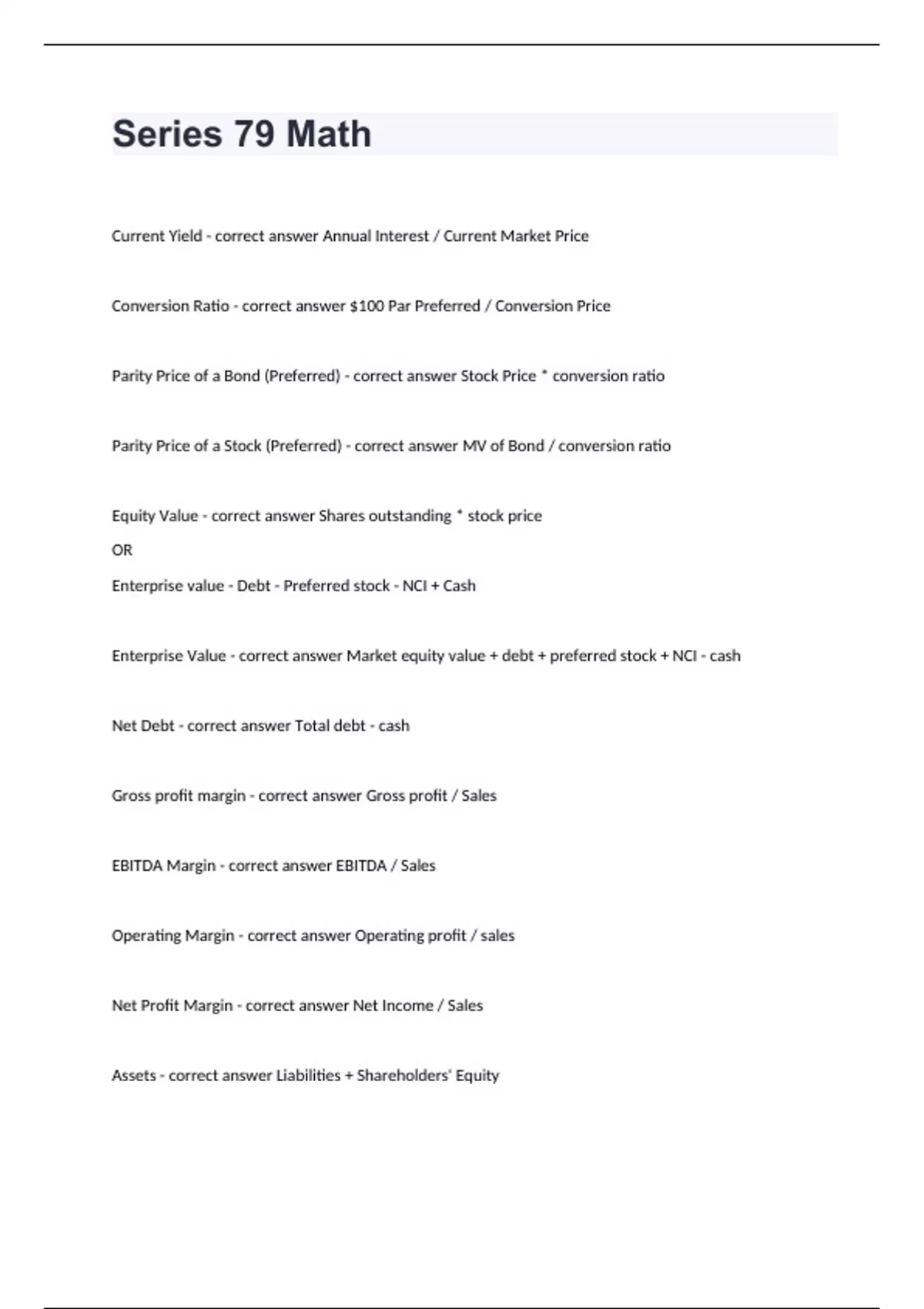 Series 79 MathCurrent Yield - correct answer Annual Interest / Current Market Price Conversion Ratio - correct answer $100 Par Preferred / Conversion Price Parity Price of a Bond (Preferred) - correct answer Stock Price * conversion ratio Parity Price of a Stock (Preferred) - correct answer MV of Bond / conversion ratio Equity Value - correct answer Shares outstanding * stock price OR Enterprise value - Debt - Preferred stock - NCI + Cash Enterprise Value - correct answer Market equity value + debt + preferred stock + NCI - cash Net Debt - correct answer Total debt - cash Gross profit margin - correct answer Gross profit / Sales EBITDA Margin - correct answer EBITDA / Sales Operating Margin - correct answer Operating profit / sales Net Profit Margin - correct answer Net Income / Sales