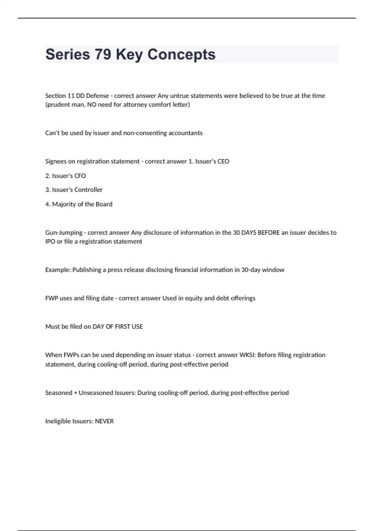 Series 79 Key ConceptsSection 11 DD Defense - correct answer Any untrue statements were believed to be true at the time (prudent man, NO need for attorney comfort letter) Can't be used by issuer and non-consenting accountants Signees on registration statement - correct answer 1. Issuer's CEO 2. Issuer's CFO 3. Issuer's Controller 4. Majority of the Board Gun-Jumping - correct answer Any disclosure of information in the 30 DAYS BEFORE an issuer decides to IPO or file a registration statement Example: Publishing a press release disclosing financial information in 30-day window FWP uses and filing date - correct answer Used in equity and debt offerings Must be filed on DAY OF FIRST USE When FWPs can be used depending on issuer status - correct answer WKSI: Before filing registration statement, during cooling-off period, during post-effective period Seasoned + Unseasoned Issuers: During cooling-off period, during post-effective period Ineligible Issuers: NEVER