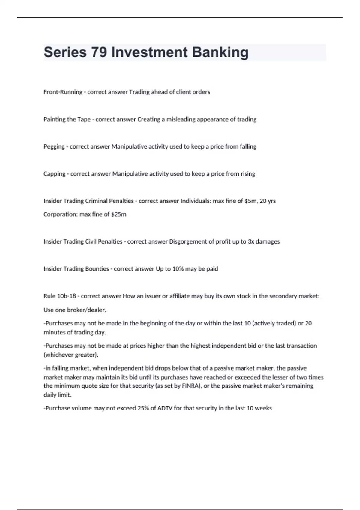 Series 79 Investment Banking Front-Running - correct answer Trading ahead of client orders Painting the Tape - correct answer Creating a misleading appearance of trading Pegging - correct answer Manipulative activity used to keep a price from falling Capping - correct answer Manipulative activity used to keep a price from rising Insider Trading Criminal Penalties - correct answer Individuals: max fine of $5m, 20 yrs Corporation: max fine of $25m Insider Trading Civil Penalties - correct answer Disgorgement of profit up to 3x damages Insider Trading Bounties - correct answer Up to 10% may be paid Rule 10b-18 - correct answer How an issuer or affiliate may buy its own stock in the secondary market: Use one broker/dealer. -Purchases may not be made in the beginning of the day or within the last 10 (actively traded) or 20 minutes of trading day. -Purchases may not be made at prices higher than the highest independent bid or the last transaction (whichever greater). -in falling market, when independent bid drops below that of a passive market maker, the passive market maker may maintain its bid until its purchases have reached or exceeded the lesser of two times the minimum quote size for that security (as set by FINRA), or the passive market maker's remaining daily limit. -Purchase volume may not exceed 25% of ADTV for that security in the last 10 weeks