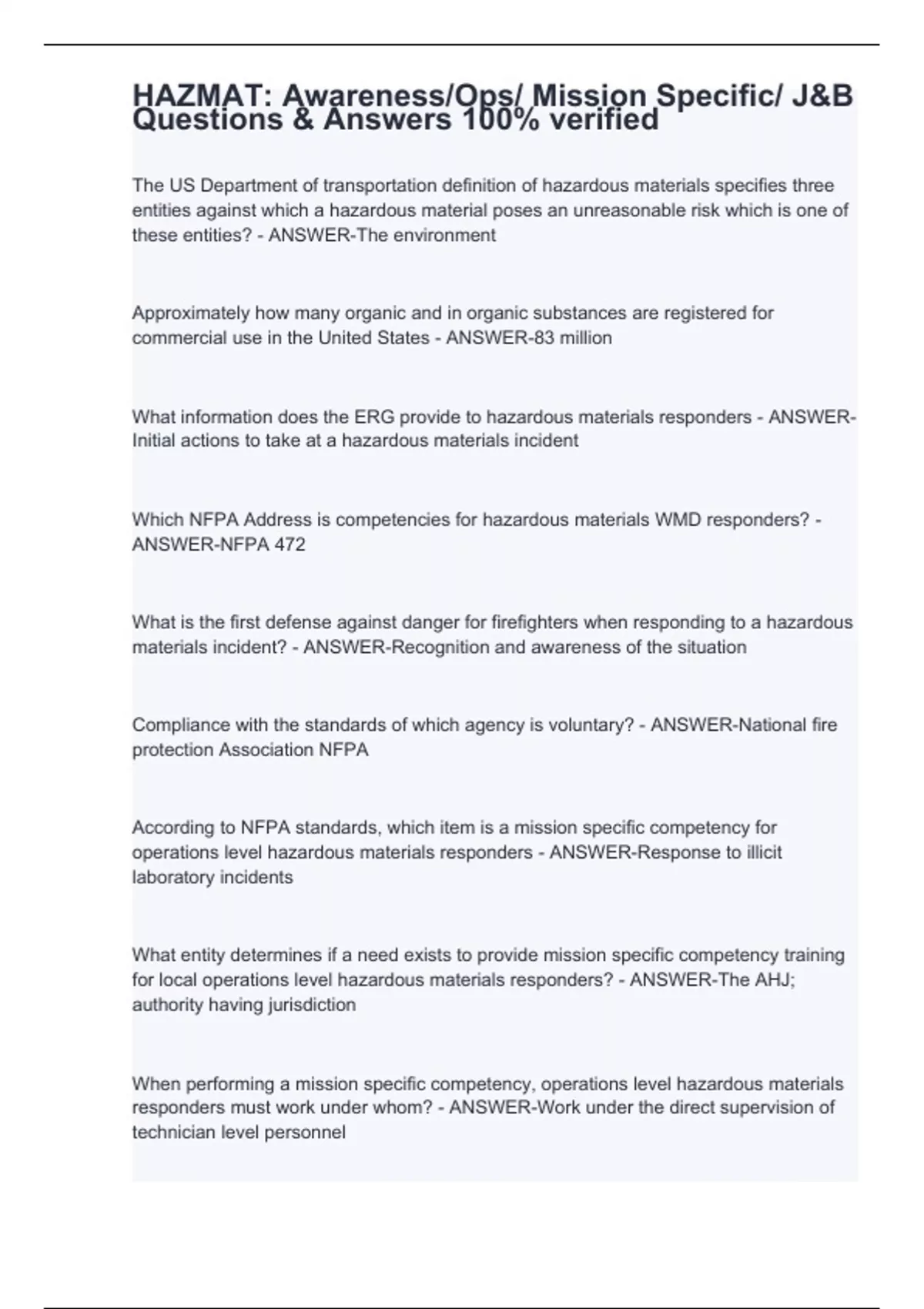 HAZMAT: Awareness/Ops/ Mission Specific/ J&B Questions & Answers 100% verified