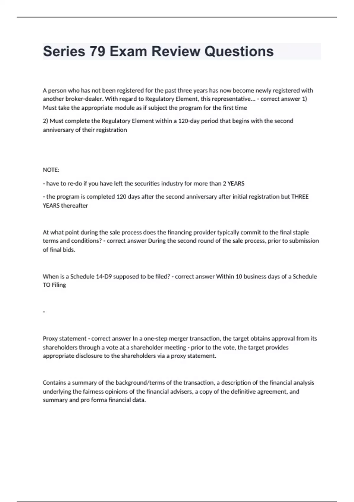 Series 79 Exam Review QuestionsA person who has not been registered for the past three years has now become newly registered with another broker-dealer. With regard to Regulatory Element, this representative... - correct answer 1) Must take the appropriate module as if subject the program for the first time 2) Must complete the Regulatory Element within a 120-day period that begins with the second anniversary of their registration NOTE: - have to re-do if you have left the securities industry for more than 2 YEARS - the program is completed 120 days after the second anniversary after initial registration but THREE YEARS thereafter At what point during the sale process does the financing provider typically commit to the final staple terms and conditions? - correct answer During the second round of the sale process, prior to submission of final bids. When is a Schedule 14-D9 supposed to be filed? - correct answer Within 10 business days of a Schedule TO Filing - Proxy statement - correct answer In a one-step merger transaction, the target obtains approval from its shareholders through a vote at a shareholder meeting - prior to the vote, the target provides appropriate disclosure to the shareholders via a proxy statement. Contains a summary of the background/terms of the transaction, a description of the financial analysis underlying the fairness opinions of the financial advisers, a copy of the definitive agreement, and summary and pro forma financial data.