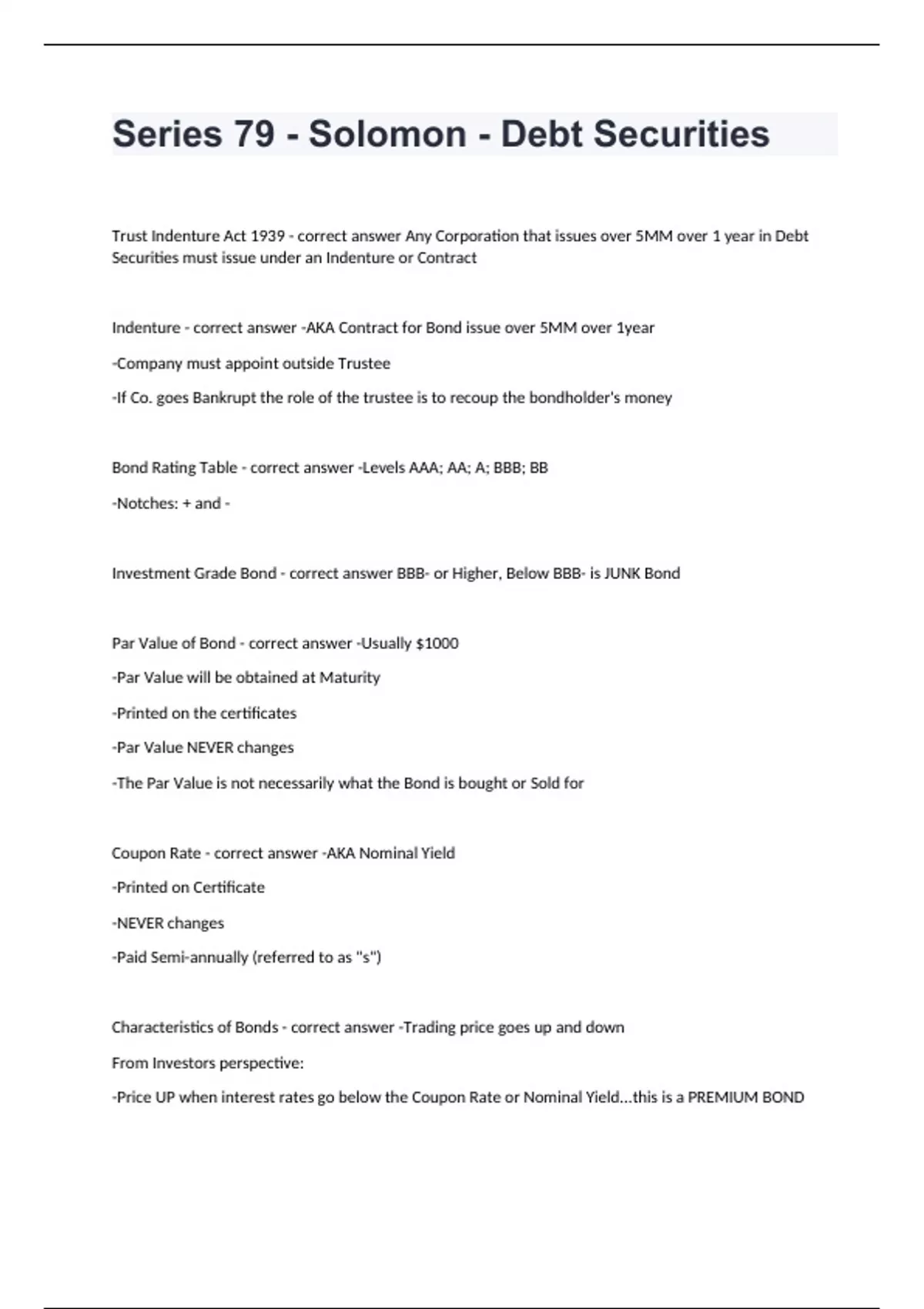 Series 79 - Solomon - Debt SecuritiesTrust Indenture Act 1939 - correct answer Any Corporation that issues over 5MM over 1 year in Debt Securities must issue under an Indenture or Contract Indenture - correct answer -AKA Contract for Bond issue over 5MM over 1year -Company must appoint outside Trustee -If Co. goes Bankrupt the role of the trustee is to recoup the bondholder's money Bond Rating Table - correct answer -Levels AAA; AA; A; BBB; BB -Notches: + and - Investment Grade Bond - correct answer BBB- or Higher, Below BBB- is JUNK Bond Par Value of Bond - correct answer -Usually $1000 -Par Value will be obtained at Maturity -Printed on the certificates -Par Value NEVER changes -The Par Value is not necessarily what the Bond is bought or Sold for Coupon Rate - correct answer -AKA Nominal Yield -Printed on Certificate -NEVER changes -Paid Semi-annually (referred to as "s") Characteristics of Bonds - correct answer -Trading price goes up and down From Investors perspective: -Price UP when interest rates go below the Coupon Rate or Nominal Yield...this is a PREMIUM BOND