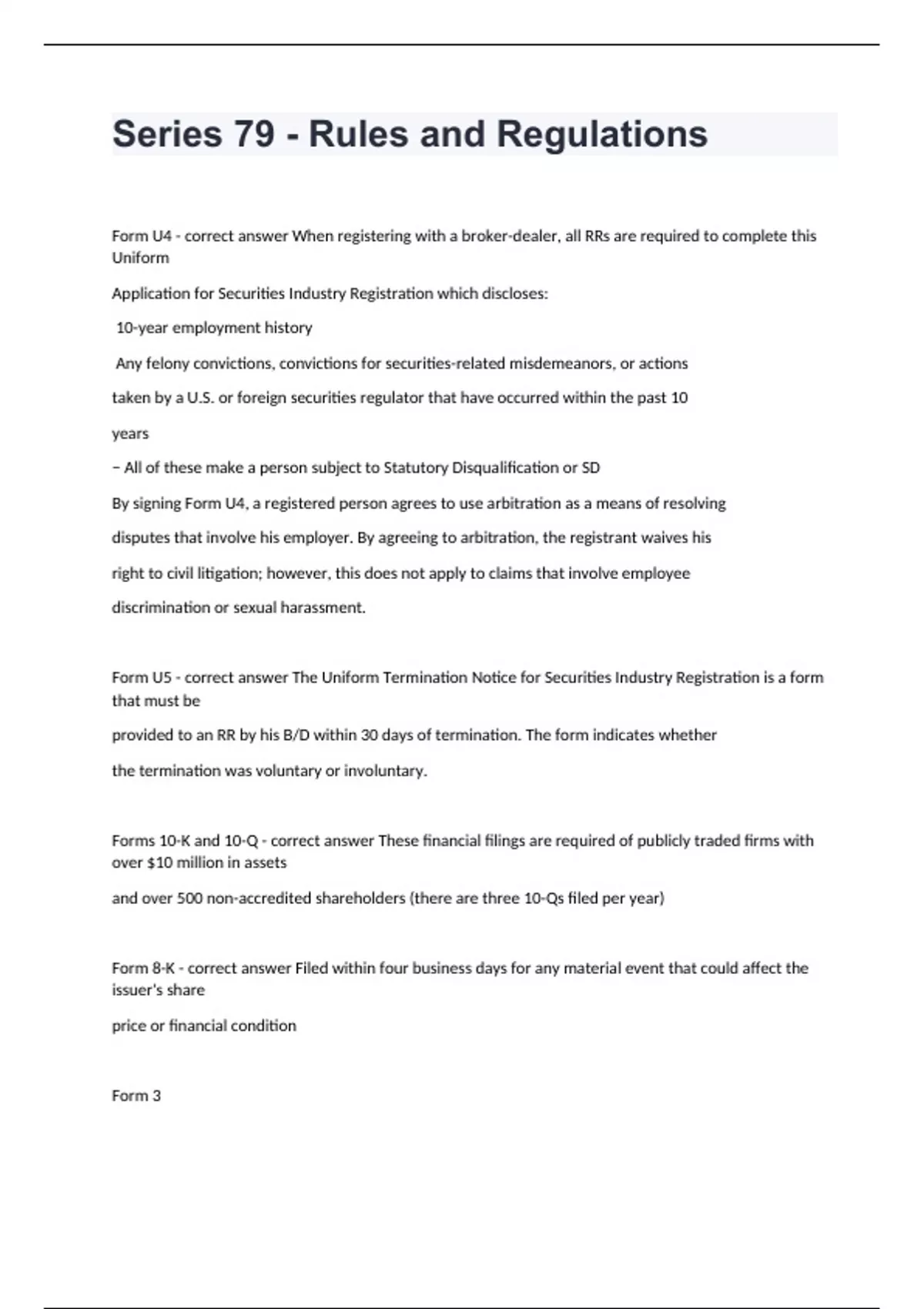 Series 79 - Rules and Regulations Form U4 - correct answer When registering with a broker-dealer, all RRs are required to complete this Uniform Application for Securities Industry Registration which discloses: 10-year employment history Any felony convictions, convictions for securities-related misdemeanors, or actions taken by a U.S. or foreign securities regulator that have occurred within the past 10 years − All of these make a person subject to Statutory Disqualification or SD By signing Form U4, a registered person agrees to use arbitration as a means of resolving disputes that involve his employer. By agreeing to arbitration, the registrant waives his right to civil litigation; however, this does not apply to claims that involve employee discrimination or sexual harassment. Form U5 - correct answer The Uniform Termination Notice for Securities Industry Registration is a form that must be provided to an RR by his B/D within 30 days of termination. The form indicates whether the termination was voluntary or involuntary. Forms 10-K and 10-Q - correct answer These financial filings are required of publicly traded firms with over $10 million in assets and over 500 non-accredited shareholders (there are three 10-Qs filed per year) Form 8-K - correct answer Filed within four business days for any material event that could affect the issuer's share price or financial condition Form 3